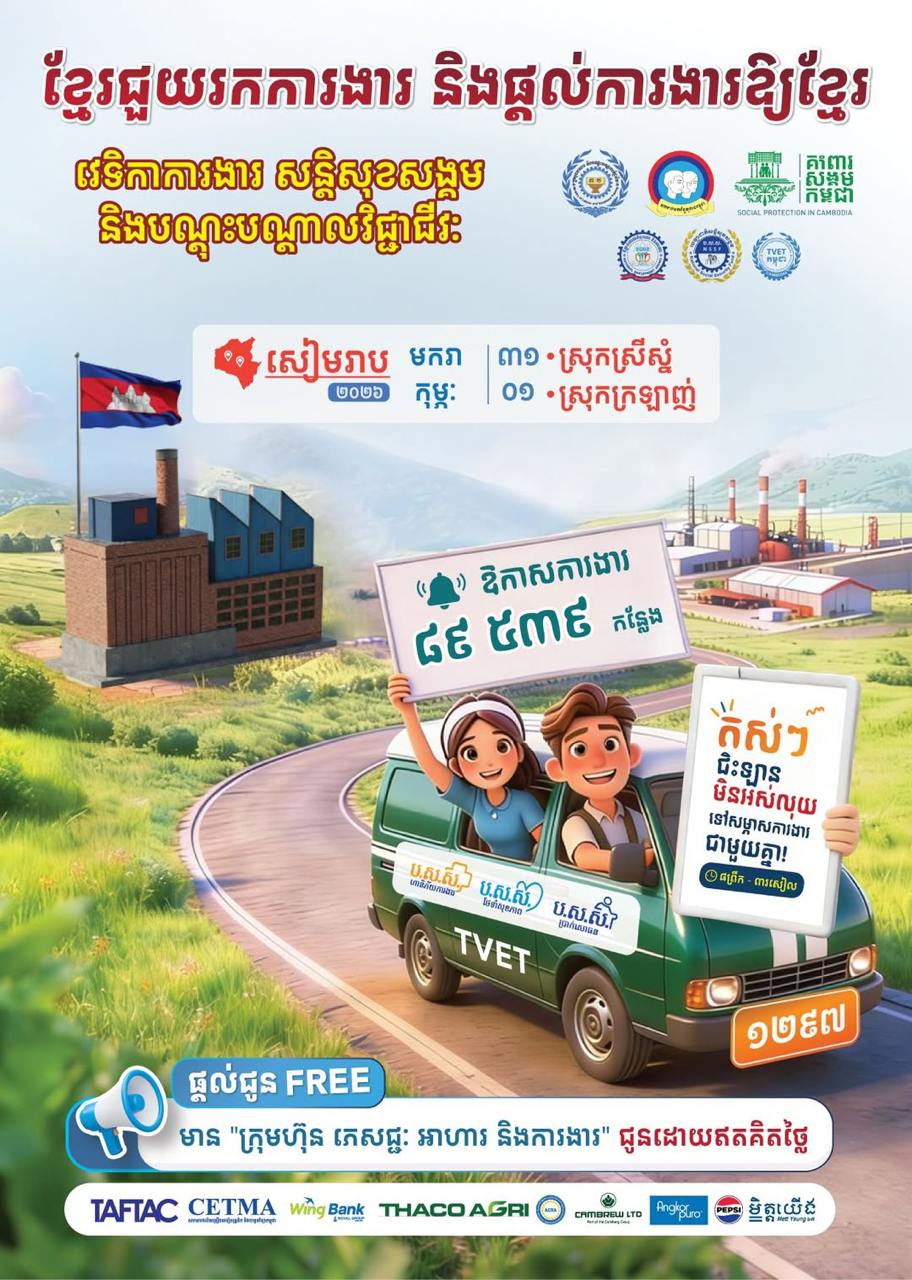 រាជធានីភ្នំពេញ ៖ លោក ស៊ុន មេសា អ្នកនាំពាក្យក្រសួងការងារ និងបណ្តុះបណ្តាលវិជ្ជាជីវៈ នៅរសៀលថ្ងៃទី៣០ ខែមករា ឆ្នាំ២០២៦នេះ បានអំពាវនាវដល់អតីតពលករត្រឡប់ពីប្រទេសថៃ យុវជន និងអ្នកកំពុងស្វែងរកការងារធ្វើនៅខេត្ដសៀមរាប សូមចូលរួមវេទិការងារ សន្ដិសុខសង្គម និងបណ្តុះបណ្តាលវិជ្ជាជីវៈ នាចុងសប្តាហ៍នេះដើម្បីទទួលបានការងារធ្វើភ្លាមៗ ខណៈឱកាសការងារមានជិត ៩ម៉ឺនកន្លេង។