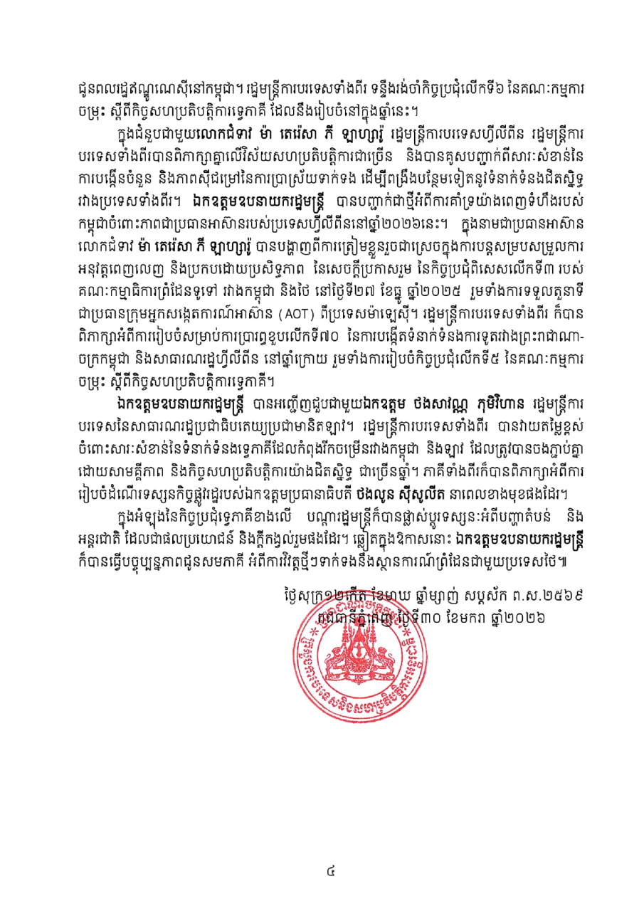 ឯកឧត្ដមឧបនាយករដ្ឋមន្ត្រី បានបញ្ជាក់ជាថ្មីអំពីការគាំទ្រយ៉ាងពេញទំហឹងរបស់ កម្ពុជាចំពោះភាពជាប្រធានអាស៊ានរបស់ប្រទេសហ្វីលីពីននៅឆ្នាំ២០២៦នេះ។ ក្នុងនាមជាប្រធានអាស៊ាន លោកជំទាវ ម៉ា តេរ៉េសា ភី ឡាហ្សារ៉ូ បានបង្ហាញពីការត្រៀមខ្លួនរួចជាស្រេចក្នុងការបន្តសម្របសម្រួលការ អនុវត្តពេញលេញ និងប្រកបដោយប្រសិទ្ធភាពនៃសេចក្តីប្រកាសរួម នៃកិច្ចប្រជុំពិសេសលើកទី៣ របស់គណៈកម្មាធិការព្រំដែនទូទៅ រវាងកម្ពុជា និងថៃ នៅថ្ងៃទី២៧ ខែធ្នូ ឆ្នាំ២០២៥ រួមទាំងការទទួលតួនាទី ជាប្រធានក្រុមអ្នកសង្កេតការណ៍អាស៊ាន (AOT) ពីប្រទេសម៉ាឡេស៊ី។