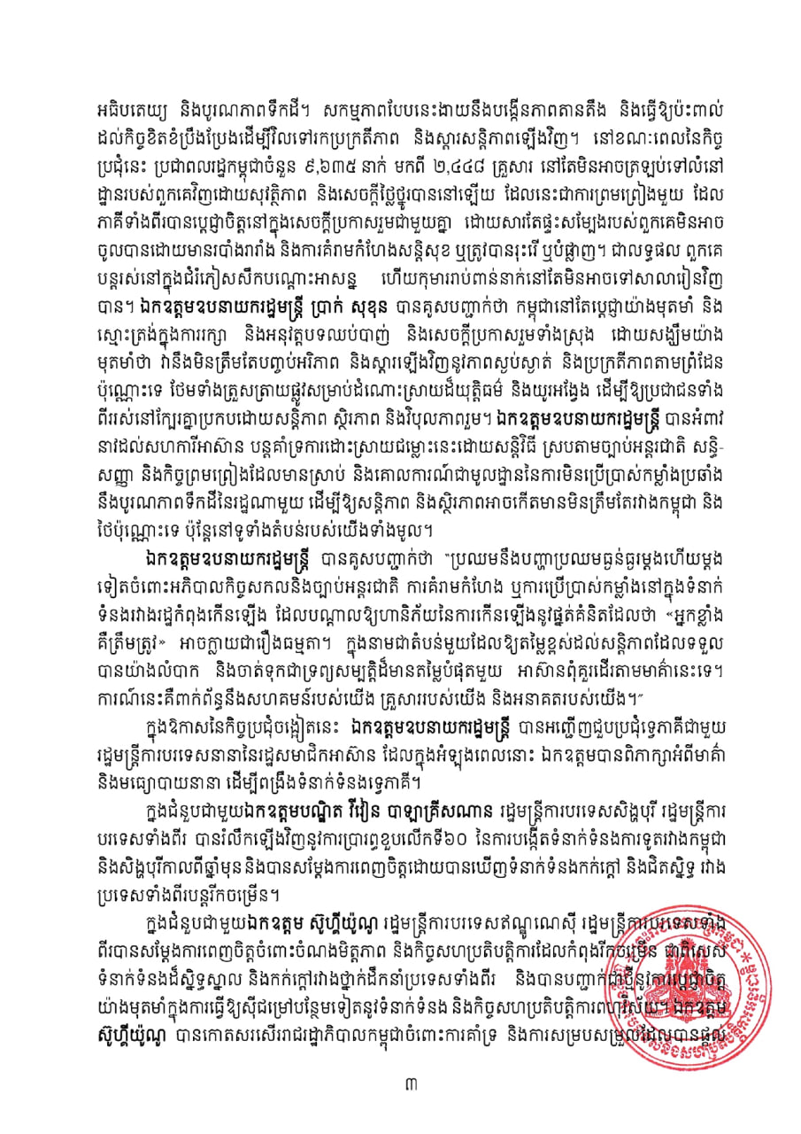 ឯកឧត្តមឧបនាយករដ្ឋមន្ត្រី បានសង្កត់ធ្ងន់ថា ទោះបីជាមានការរីកចម្រើនជាវិជ្ជមានចាប់តាំងពីមានបទឈប់បាញ់ក៏ដោយ ក៏នៅតែមានសកម្មភាពមួយចំនួន ដែលមិនស្របនឹងសេចក្ដីប្រកាសរួម នៃកិច្ចប្រជុំពិសេស លើកទី៣ របស់គណៈកម្មាធិការព្រំដែនទូទៅនេះ ជាពិសេសទាក់ទងនឹងការគោរពអធិបតេយ្យ និងបូរណភាពទឹកដី។ សកម្មភាពបែបនេះ ងាយនឹងបង្កើនភាពតានតឹង និងធ្វើឱ្យប៉ះពាល់ដល់កិច្ចខិតខំប្រឹងប្រែង ដើម្បីវិលទៅរកប្រក្រតីភាព និងស្ដារសន្តិភាពឡើងវិញ។ នៅខណៈពេល នៃកិច្ចប្រជុំនេះ ប្រជាពលរដ្ឋកម្ពុជាចំនួន ៩,៦៣៥ នាក់ មកពី ២,៤៤៨ គ្រួសារ នៅតែមិនអាចត្រឡប់ទៅលំនៅដ្ឋានរបស់ពួកគេវិញ ដោយសុវត្ថិភាព និងសេចក្ដីថ្លៃថ្នូរបាននៅឡើយ ដែលនេះជាការព្រមព្រៀងមួយ ដែលភាគីទាំងពីរបានប្តេជ្ញាចិត្តនៅក្នុងសេចក្ដីប្រកាសរួមជាមួយគ្នា ដោយសារតែផ្ទះសម្បែងរបស់ពួកគេមិនអាចចូលបានដោយមានរបាំងរារាំង និងការគំរាមកំហែងសន្តិសុខ ឬត្រូវបានរុះរើ ឬបំផ្លាញ។ ជាលទ្ធផល ពួកគេបន្តរស់នៅក្នុងជំរំភៀសសឹកបណ្ដោះអាសន្ន ហើយកុមាររាប់ពាន់នាក់នៅតែមិនអាចទៅសាលារៀនវិញបាន។ ឯកឧត្តម ឧបនាយករដ្ឋមន្ត្រី ប្រាក់ សុខុន បានគូសបញ្ជាក់ថា កម្ពុជានៅតែប្តេជ្ញាយ៉ាងមុតមាំ និងស្មោះត្រង់ក្នុងការរក្សា និងអនុវត្តបទឈប់បាញ់ និងសេចក្តីប្រកាសរួមទាំងស្រុង ដោយសង្ឃឹមយ៉ាងមុតមាំថា វានឹងមិនត្រឹមតែបញ្ចប់អរិភាព និងស្តារឡើងវិញ នូវភាពស្ងប់ស្ងាត់ និងប្រក្រតីភាពតាមព្រំដែន ប៉ុណ្ណោះទេ ថែមទាំងត្រួសត្រាយផ្លូវសម្រាប់ដំណោះស្រាយដ៏យុត្តិធម៌ និងយូរអង្វែង ដើម្បីឱ្យប្រជាជនទាំងពីររស់នៅក្បែរគ្នាប្រកបដោយសន្តិភាព ស្ថិរភាព និងវិបុលភាពរួម។ ឯកឧត្តម ឧបនាយករដ្ឋមន្ត្រី បានអំពាវ នាវដល់សហការីអាស៊ាន បន្តគាំទ្រការដោះស្រាយជម្លោះនេះដោយសន្តិវិធី ស្របតាមច្បាប់អន្តរជាតិ សន្ធិ-សញ្ញា និងកិច្ចព្រមព្រៀងដែលមានស្រាប់ និងគោលការណ៍ជាមូលដ្ឋាន នៃការមិនប្រើប្រាស់កម្លាំងប្រឆាំង នឹងបូរណភាពទឹកដី នៃរដ្ឋណាមួយ ដើម្បីឱ្យសន្តិភាព និងស្ថិរភាពអាចកើតមានមិនត្រឹមតែរវាងកម្ពុជា និងថៃប៉ុណ្ណោះទេ ប៉ុន្តែនៅទូទាំងតំបន់របស់យើងទាំងមូល។