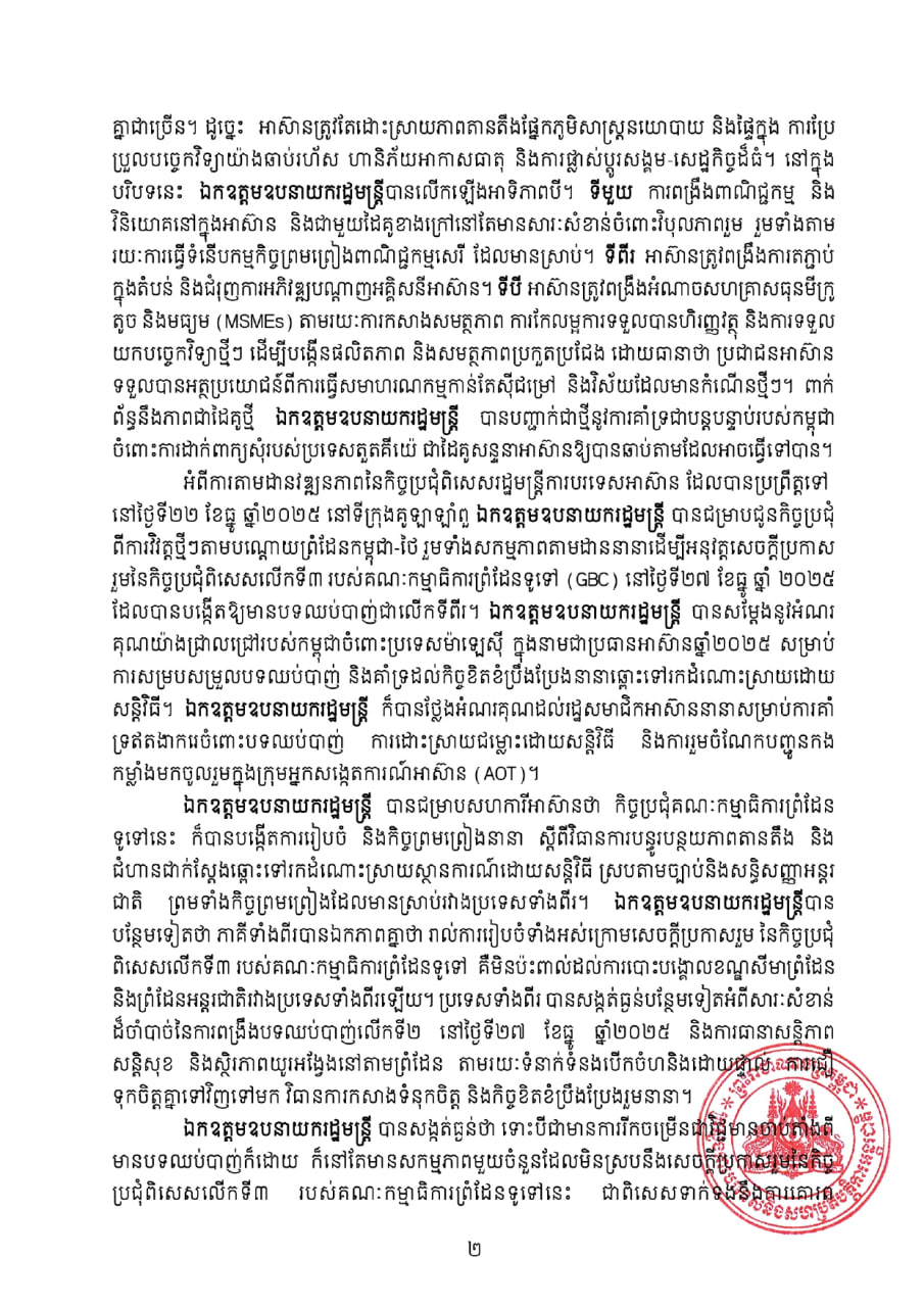 ឯកឧត្តម ឧបនាយករដ្ឋមន្ត្រី បានជម្រាបសហការីអាស៊ានថា កិច្ចប្រជុំគណៈកម្មាធិការព្រំដែន ទូទៅនេះ ក៏បានបង្កើតការរៀបចំ និងកិច្ចព្រមព្រៀងនានា ស្ដីពីវិធានការបន្ធូរបន្ថយភាពតានតឹង និងជំហានជាក់ស្ដែងឆ្ពោះទៅរកដំណោះស្រាយស្ថានការណ៍ដោយសន្តិវិធី ស្របតាមច្បាប់ និងសន្ធិសញ្ញាអន្តរជាតិ ព្រមទាំងកិច្ចព្រមព្រៀង ដែលមានស្រាប់រវាងប្រទេសទាំងពីរ។ ឯកឧត្តមឧបនាយករដ្ឋមន្ត្រីបានបន្ថែមទៀតថា ភាគីទាំងពីរ បានឯកភាពគ្នាថា រាល់ការរៀបចំទាំងអស់ក្រោមសេចក្តីប្រកាសរួម នៃកិច្ចប្រជុំពិសេសលើកទី៣ របស់គណៈកម្មាធិការព្រំដែនទូទៅ គឺមិនប៉ះពាល់ដល់ការបោះបង្គោលខណ្ឌសីមាព្រំដែន និងព្រំដែនអន្តរជាតិរវាងប្រទេសទាំងពីរឡើយ។ ប្រទេសទាំងពីរ បានសង្កត់ធ្ងន់បន្ថែមទៀត អំពីសារៈសំខាន់ ដ៏ចាំបាច់នៃការពង្រឹងបទឈប់បាញ់លើកទី២ នៅថ្ងៃទី២៧ ខែធ្នូ ឆ្នាំ២០២៥ និងការធានាសន្តិភាព សន្តិសុខ និងស្ថិរភាពយូរអង្វែងនៅតាមព្រំដែន តាមរយៈទំនាក់ទំនងបើកចំហ និងដោយផ្ទាល់ឧការជឿ ទុកចិត្តគ្នាទៅវិញទៅមក វិធានការកសាងទំនុកចិត្ត និងកិច្ចខិតខំប្រឹងប្រែងរួមនានា ។