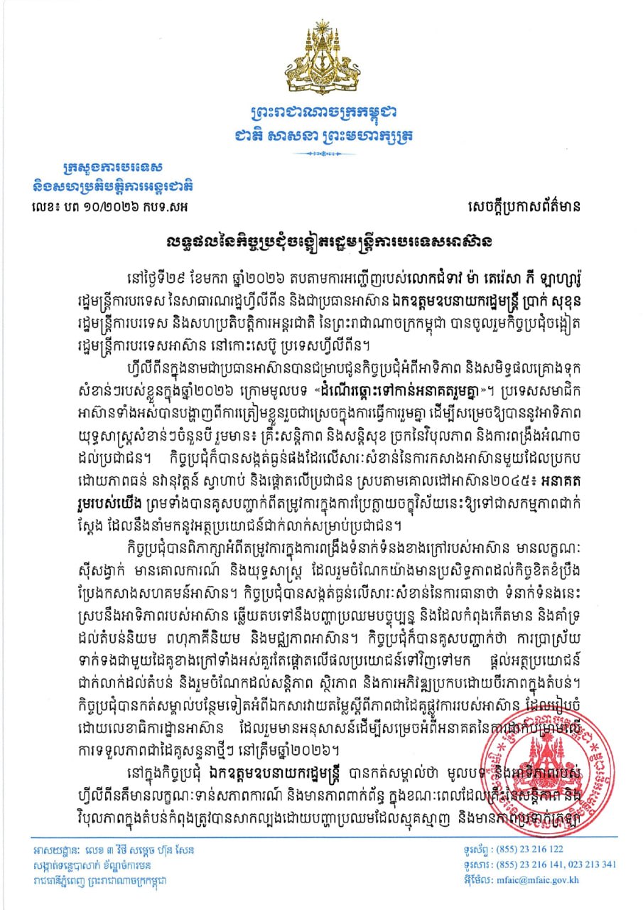 រាជធានីភ្នំពេញ ៖ នៅថ្ងៃទី២៩ ខែមករា ឆ្នាំ២០២៦ តបតាមការអញ្ជើញរបស់លោកជំទាវ ម៉ា តេរ៉េសា ភី ឡាហ្សារ៉ូ រដ្ឋមន្ត្រីការបរទេស នៃសាធារណរដ្ឋហ្វីលីពីន និងជាប្រធានអាស៊ាន ឯកឧត្តមឧបនាយករដ្ឋមន្ត្រី ប្រាក់ សុខុន រដ្ឋមន្ត្រីការបរទេស និងសហប្រតិបត្តិការអន្តរជាតិ នៃព្រះរាជាណាចក្រកម្ពុជា បានចូលរួមកិច្ចប្រជុំចង្អៀត រដ្ឋមន្ត្រីការបរទេសអាស៊ាន នៅកោះសេប៊ូ ប្រទេសហ្វីលីពីន ។