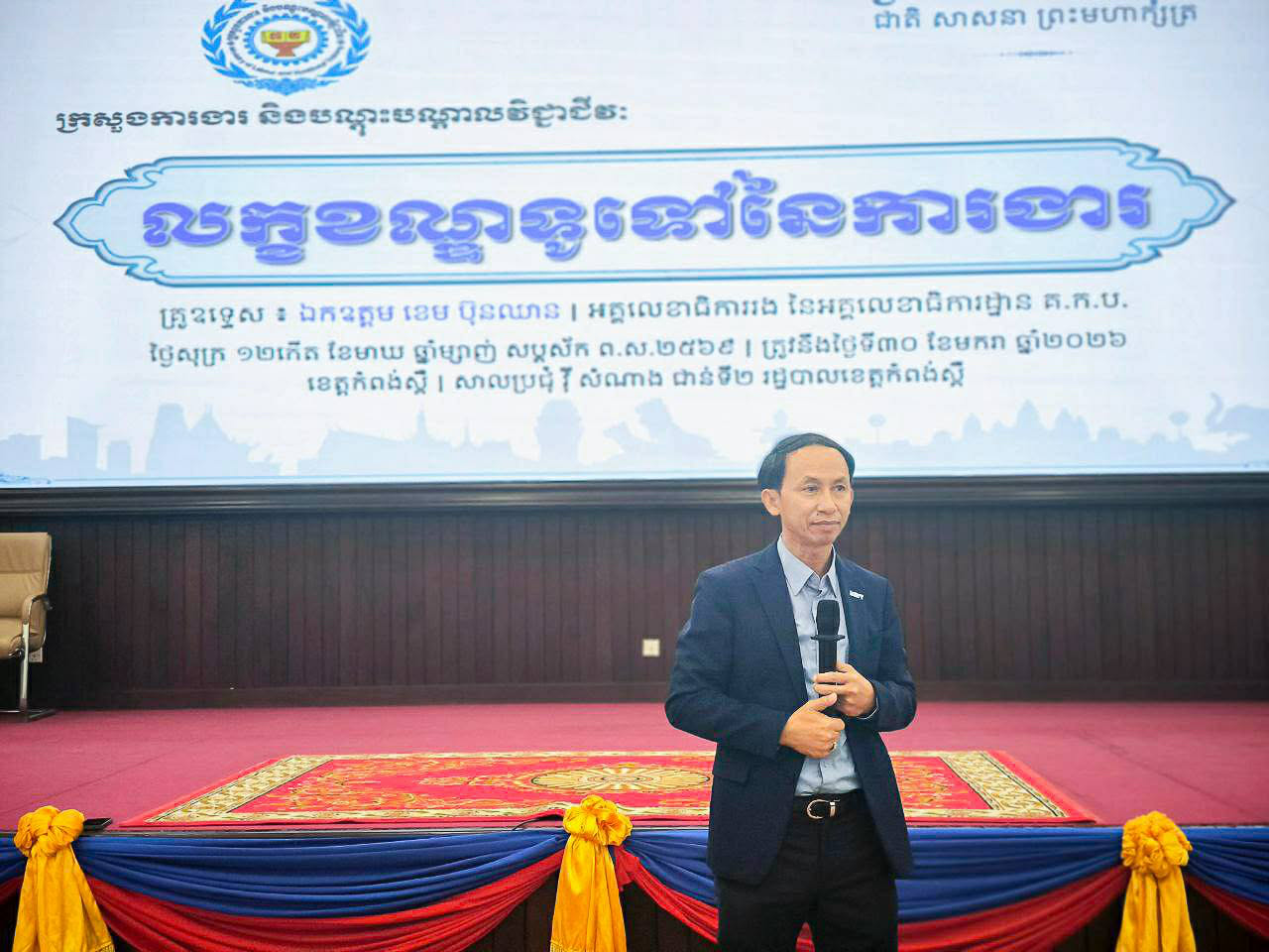 ខេត្តកំពង់ស្ពឺ ៖ នាព្រឹកថ្ងៃទី៣០ ខែមករា ឆ្នាំ២០២៦ ឯកឧត្តម ទុយ ស៊ីផាន់ រដ្ឋលេខាធិការ តំណាងដ៏ខ្ពង់ខ្ពស់ ឯកឧត្តម ហេង សួរ រដ្ឋមន្ត្រីក្រសួងការងារ និងបណ្តុះបណ្តាលវិជ្ជាជីវៈ និងឯកឧត្តម តូច ប៉ូលីវ៉ា អភិបាលរងនៃគណៈអភិបាលខេត្តកំពង់ស្ពឺ បានអញ្ជើញជាអធិបតីក្នុងពិធីបើកវគ្គបណ្តុះបណ្តាលស្តីពីបទប្បញ្ញត្តិច្បាប់ស្តីពីការងារជូនដល់រដ្ឋបាល សហជីព និងប្រតិភូបុគ្គលិកមកពីបណ្តាសហគ្រាស គ្រឹះស្ថាន និងរោងចក្រនានា ។