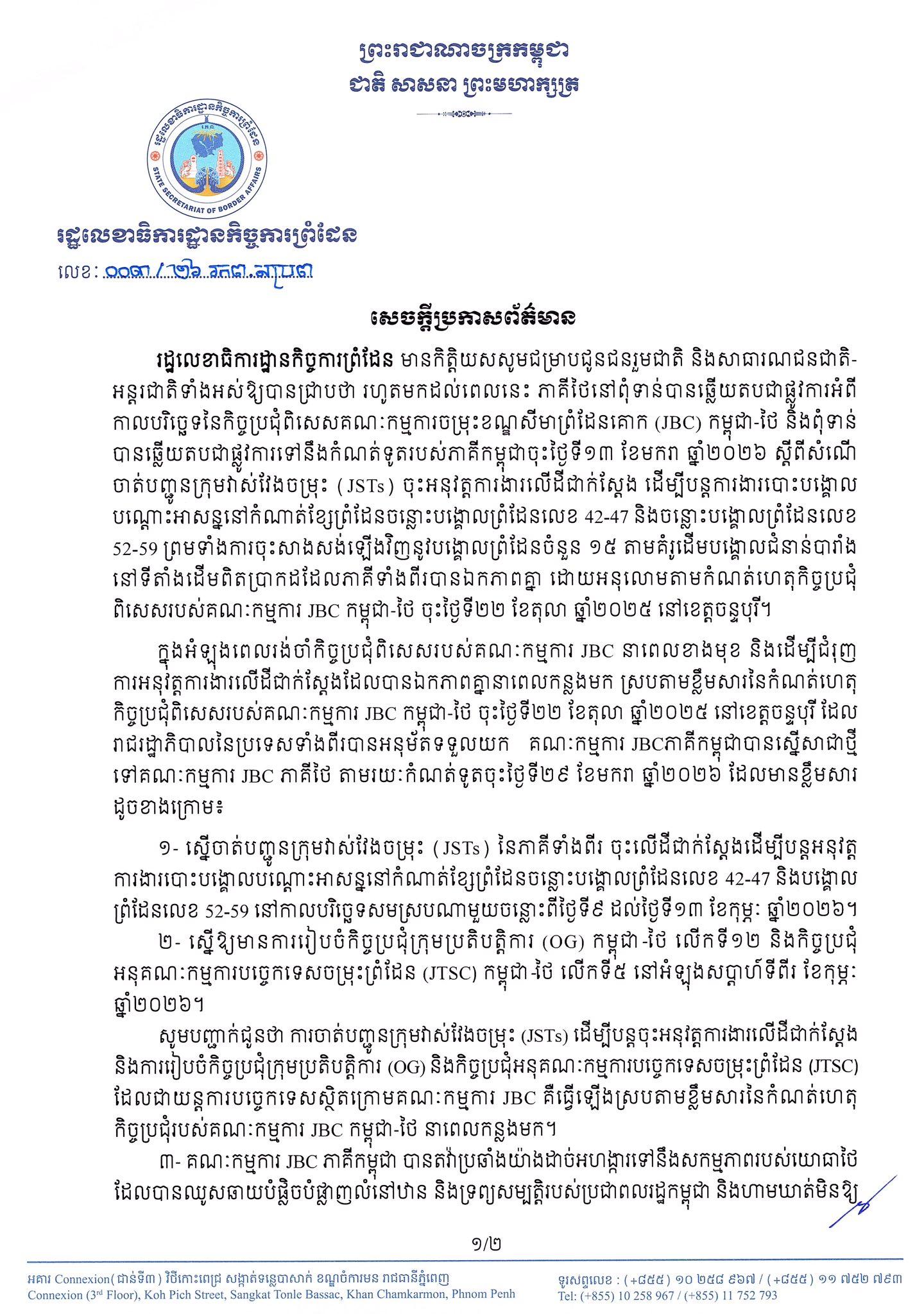 បើតាមសេចក្តីប្រកាសព័ត៌មានរបស់រដ្ឋលេខាធិការដ្ឋានកិច្ចការព្រំដែន បានឲ្យដឹងថា រហូតមកដល់ពេលនេះ ភាគីថៃ នៅពុំទាន់បានឆ្លើយតបជាផ្លូវការអំពី កាលបរិច្ឆេទ នៃកិច្ចប្រជុំពិសេសគណៈកម្មការចម្រុះខណ្ឌសីមាព្រំដែនគោក (IBC) កម្ពុជា-ថៃ នឹងពុំទាន់ បានឆ្លើយតបជាផ្លូវការទៅនឹងកំណត់ទូតរបស់ភាគីកម្ពុជាចុះថ្ងៃទី១៣ ខែមករា ឆ្នាំ២០២៦ ស្តីពីសំណើ ចាត់បញ្ជូនក្រុមវាស់វែងចម្រុះ (JSTs) ចុះអនុវត្តការងារលើដីជាក់ស្ដែង ដើម្បីបន្តការងារបោះបង្គោលបណ្តោះអាសន្ន នៅកំណាត់ខ្សែព្រំដែនចន្លោះបង្គោលព្រំដែនលេខ 42-47 និងចន្លោះបង្គោលព្រំដែនលេខ 52-59 ព្រមទាំងការចុះសាងសង់ឡើងវិញ នូវបង្គោលព្រំដែនចំនួន ១៥ តាមគំរូដើមបង្គោលជំនាន់បារាំង នៅទីតាំងដើមពិតប្រាកដដែលភាគីទាំងពីរបានឯកភាពគ្នា ដោយអនុលោមតាមកំណត់ហេតុកិច្ចប្រជុំ ពិសេសរបស់គណៈកម្មការ IBC កម្ពុជា-ថៃ ចុះថ្ងៃទី២២ ខែតុលា ឆ្នាំ២០២៥ នៅខេត្តចន្ទបុរី ។