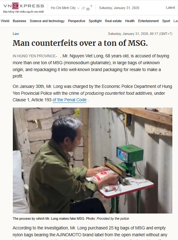 វៀតណាម ៖ បុរសវ័យចំណាស់ម្នាក់ត្រូវបានសមត្ថកិច្ចវៀតណាមបង្ក្រាប និងឃាត់ខ្លួនបាន បន្ទាប់ពីរកឃើញថា បានលួចធ្វើសកម្មភាពផលិត និងវេចខ្ចប់ប៊ីចេងក្លែងក្លាយម៉ាកល្បី (AJINOMOTO) ក្នុងបរិមាណយ៉ាងច្រើនសន្ធឹកសន្ធាប់ រហូតដល់ជាង ១ តោន ដើម្បីចែកចាយបន្លំភ្នែកអ្នកប្រើប្រាស់យកចំណេញផ្ទាល់ខ្លួន ។ នេះបើយោងតាមការចុះផ្សាយរបស់សារព័ត៌មាន VN Express នៅថ្ងៃទី៣១ ខែមករា ឆ្នាំ២០២៦ ។