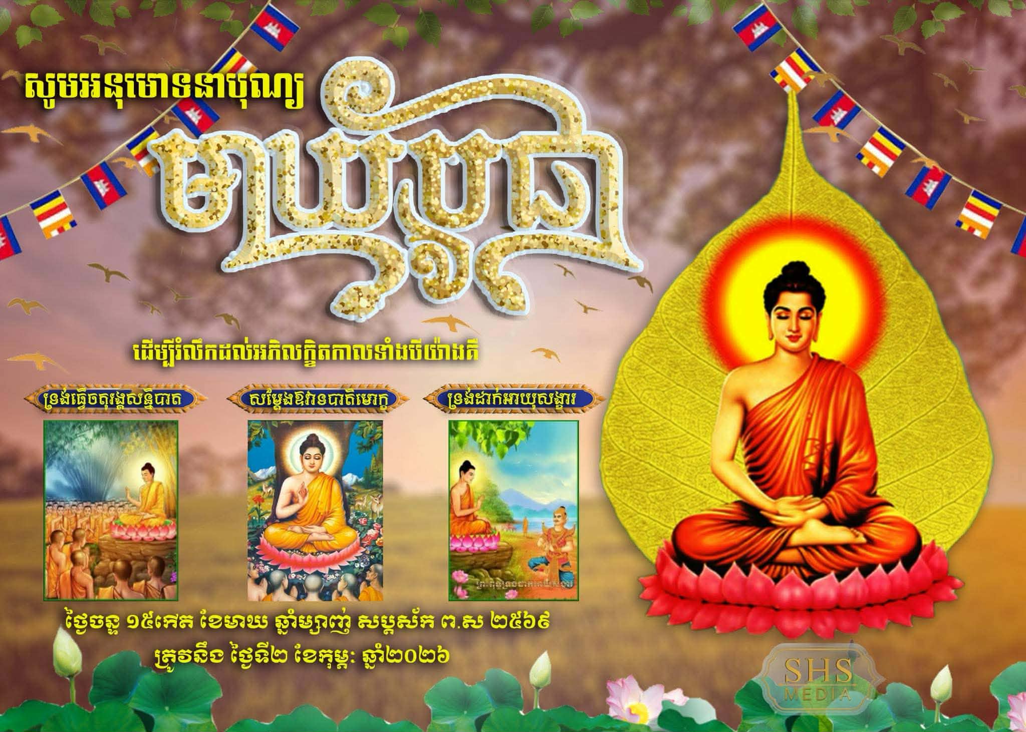 គួរបញ្ជក់ផងដែរថា ឆ្នាំនេះ គណៈកម្មាធិការជាតិរៀបចំបុណ្យជាតិ-អន្តរជាតិ បានរៀបចំពិធីបុណ្យមាឃបូជា ដែលប្រារព្វធ្វើឡើង នៅថ្ងៃចន្ទ ១៥កើត ខែមាឃ ឆ្នាំម្សាញ់ សប្តស័ក ព.ស.២៥៦៩ ត្រូវនឹងថ្ងៃទី២ ខែកុម្ភៈ ឆ្នាំ២០២៦ នៅព្រះមហាសក្យមុនីចេតិយ ភ្នំព្រះរាជទ្រព្យ(ឧត្តុង) ស្រុកពញាឮ ខេត្តកណ្ដាល ក្រោមអធិបតីភាព ឯកឧត្តមអភិសន្តិបណ្ដិត នេត សាវឿន ឧបនាយករដ្ឋមន្ត្រី តំណាងដ៏ខ្ពង់ខ្ពស់ សម្តេចមហាបវរធិបតី ហ៊ុន ម៉ាណែត នាយករដ្ឋមន្ត្រី នៃព្រះរាជាណាចក្រកម្ពុជា ។