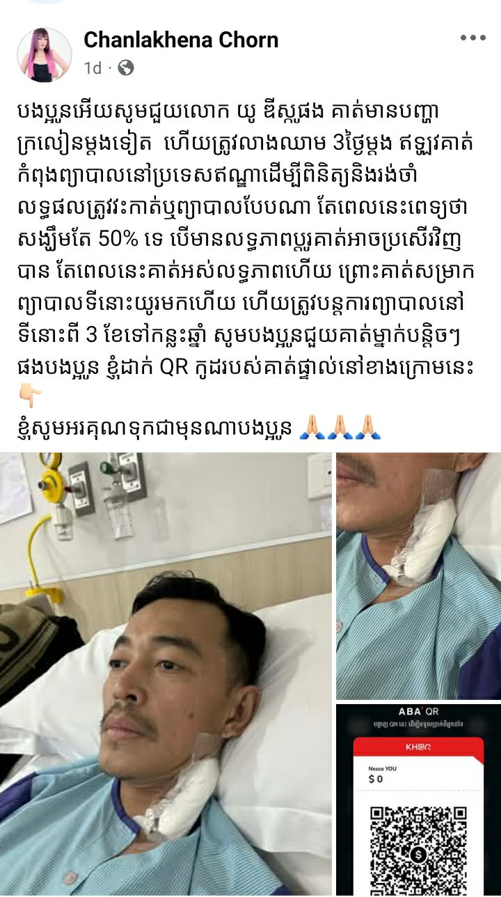 បងប្អូនអើយ សូមជួយលោក យូ ឌីស្កូផង គាត់មានបញ្ហាក្រលៀនម្តងទៀត ហើយត្រូវលាងឈាម 3ថ្ងៃម្តង ។ អ្នកនាងបន្តថា ឥឡូវគាត់កំពុងព្យាបាលនៅប្រទេសឥណ្ឌា ដើម្បីពិនិត្យនិងរង់ចាំលទ្ធផលត្រូវវះកាត់ ឬព្យាបាលបែបណា តែពេលនេះពេទ្យថាសង្ឃឹមតែ 50% ទេ បើមានលទ្ធភាពប្តូរគាត់អាចប្រសើរវិញបាន តែពេលនេះគាត់អស់លទ្ធភាពហើយ ព្រោះគាត់សម្រាកព្យាបាលទីនោះយូរមកហើយ ហើយត្រូវបន្តការព្យាបាលនៅទីនោះពី 3 ខែទៅកន្លះឆ្នាំ សូមបងប្អូនជួយគាត់ម្នាក់បន្តិចៗផងបងប្អូន ។