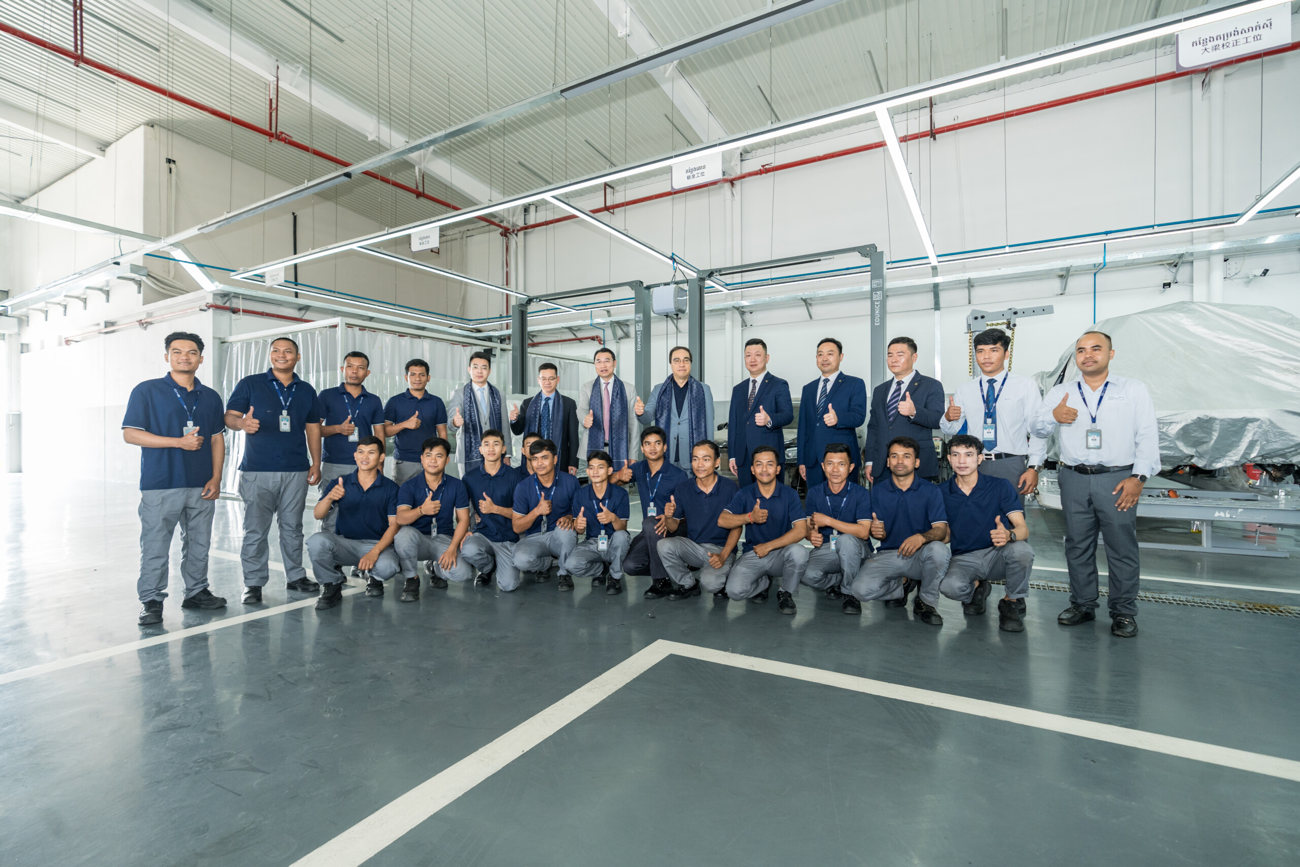 លោក Liu Xueliang (ឆ្វេងបង្អស់) និងលោក Feng Changge (ស្តាំបង្អស់) ប្រគល់រថយន្តជូនអតិថិជនដំបូងគេនៃសាខាថ្មី