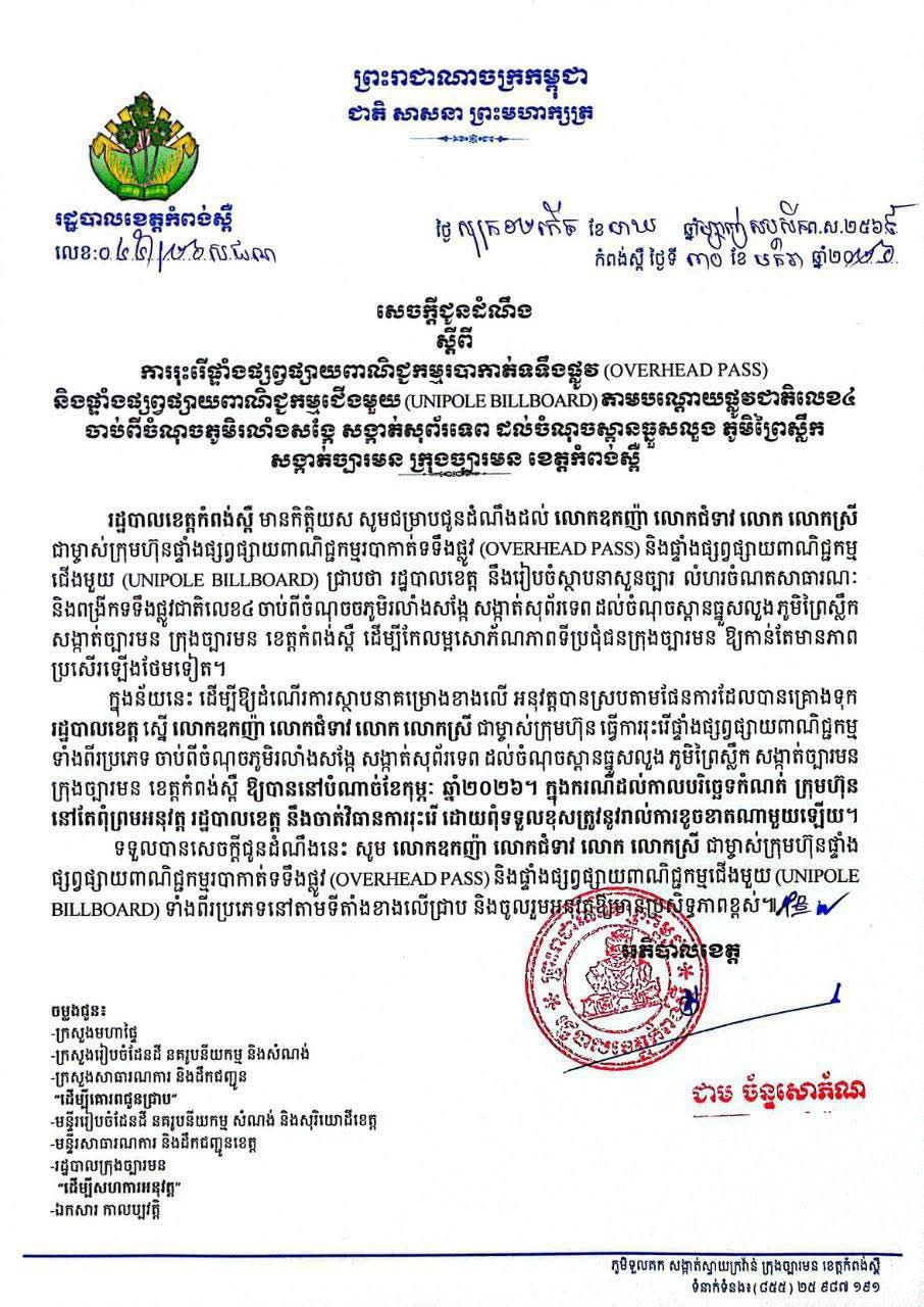 ក្នុងករណីដល់កាលបរិច្ឆេទកំណត់ ក្រុមហ៊ុន នៅតែពុំព្រមអនុវត្ត រដ្ឋបាលខេត្ត នឹងចាត់វិធានការរុះរើ ដោយពុំទទួលខុសត្រូវនូវរាល់ការខូចខាតណាមួយឡើយ។ ទទួលបានសេចក្តីជូនដំណឹងនេះ សូម លោកឧកញ៉ា លោកជំទាវ លោក លោកស្រី ជាម្ចាស់ក្រុមហ៊ុនផ្ទាំង ផ្សព្វផ្សាយពាណិជ្ជកម្មរបាកាត់ទទឹងផ្លូវ (OVERHEAD PASS) និងផ្ទាំងផ្សព្វផ្សាយពាណិជ្ជកម្មជើងមួយ (UNIPOLE BILLBOARD) ទាំងពីរប្រភេទនៅតាមទីតាំងខាងលើជ្រាប និងចូលរួមមត្តឱ្យមានប្រសិទ្ធភាពខ្ពស់៕