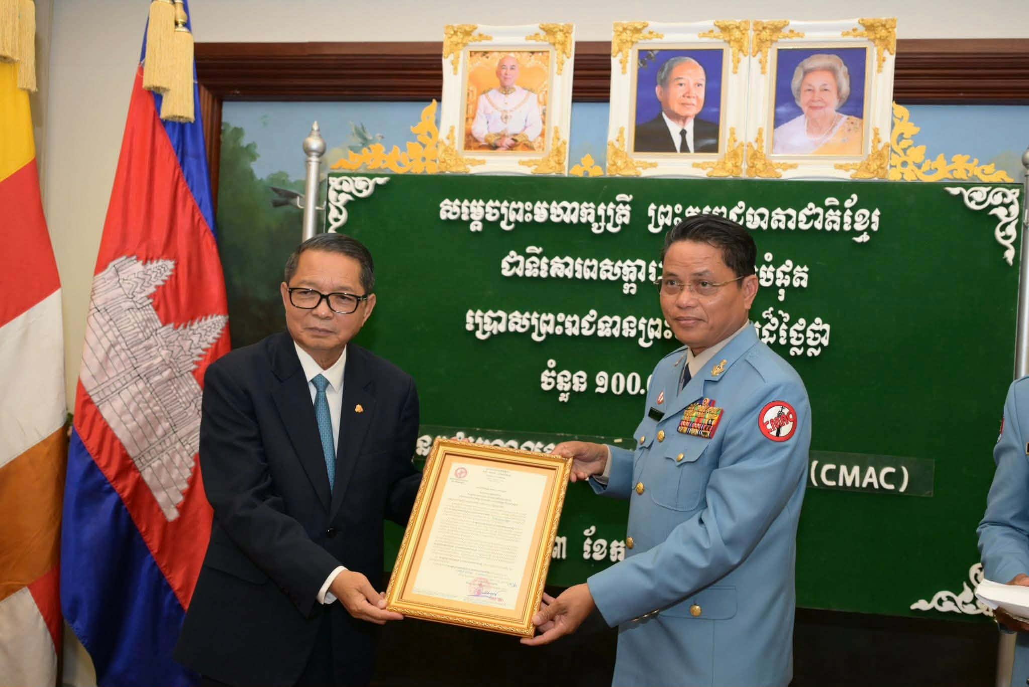 ព្រះរាជអំណោយដ៏ថ្លៃថ្លាបំផុតរបស់សម្ដេចព្រះមហាក្សត្រី ព្រះវររាជមាតាជាតិខ្មែរ ជាទីគោរពសក្ការៈដ៏ខ្ពង់ខ្ពស់បំផុត នាពេលនេះ ក៏ដូចជាពេលកន្លងមក ទាំងព្រះរាជអំណាយជាថវិកា និងជាសម្ភារៈ បានចូលរួមចំណែកយ៉ាងសំខាន់ក្នុងការកាត់បន្ថយអត្រាគ្រោះថ្នាក់ ដោយសារគ្រាប់មីននិងយុទ្ធភណ្ឌមិនទាន់ផ្ទុះ សំណល់សង្គ្រាម រំដោះផ្ទៃដីសុវត្ថិភាពជូនប្រជាពលរដ្ឋសម្រាប់បង្កបង្កើនផល លើកកម្ពស់ជីវភាពរស់នៅ និងគាំទ្រការអភិវឌ្ឍន៍សហគមន៍មូលដ្ឋាន ជាពិសេស បានបង្ហាញពីព្រះរាជហឬទ័យទុកដាក់ខ្ពស់បំផុត ដល់កងកម្លាំងទាំងអស់ នៃអង្គភាព CMAC ដែលកំពុងបំពេញកិច្ចប្រតិបត្តិការបោសសម្អាតគ្រាប់មីន និងសំណល់យុទ្ធភណ្ឌសង្គ្រាមចាស់ និងរបស់សៀមឈ្លានពានថ្មីៗនេះ ។