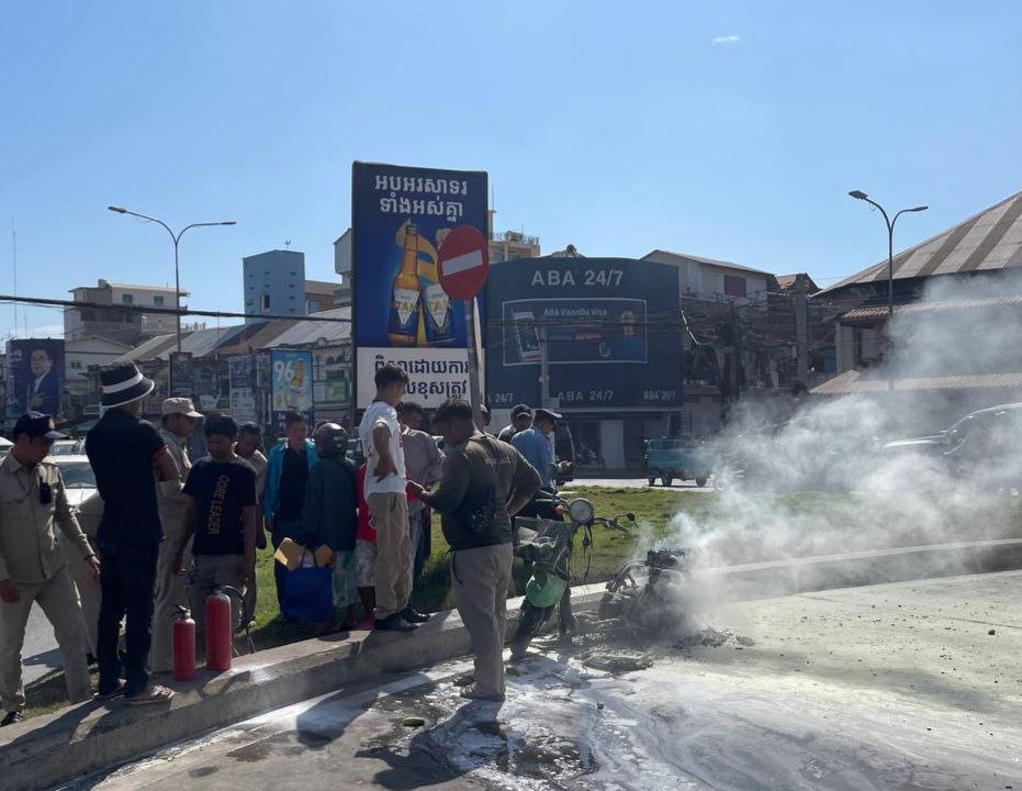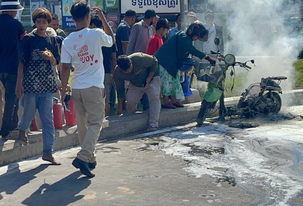 តាមសាក្សី បានអោយដឹងថា មុនពេលកើតហេតុ គេឃើញម៉ូតូ(កូនទា) ម៉ាកធូដេ១គ្រឿង បើកបរដោយស្ត្រីម្នាក់ ធ្វើដំណើរឆ្លងស្ពានព្រះមុនីវង្សក្នុងទិសដៅ ពីលិចទៅកើត។ លុះពេលធ្វើដំណើរមកដល់គល់ស្ពានខាងកើត ហើយបត់ឆ្វេងវាងរង្វង់មូល ប្រុងចូលផ្សារច្បារអំពៅ ស្រាប់តែភ្លើងបានឆាប់ឆេះម៉ូតូ ធ្វើឲ្យស្ត្រីរូបនោះ ឈប់ម៉ូតូហើយរត់ចេញ។ ភ្លាមៗ បង្កអោយមានការភ្ញាក់ផ្អើលដល់ប្រជាពលរដ្ឋ សមត្ថកិច្ច និងប្រជាការពារនាំគ្នា យកបំពង់ពន្លត់អគ្គិភ័យ ជួយបាញ់អស់ជាច្រើនបំពង់ ហើយភ្លើងបានរលត់ទៅវិញ។ ទោះបីជាយ៉ាងណា ម៉ូតូមួយគ្រឿងនោះ ត្រូវភ្លើងឆេះយ៉ាងសន្ធោសន្ធៅ នៅសល់តែគ្រោងឆ្អឹងដែកតែប៉ុណ្ណោះ ។