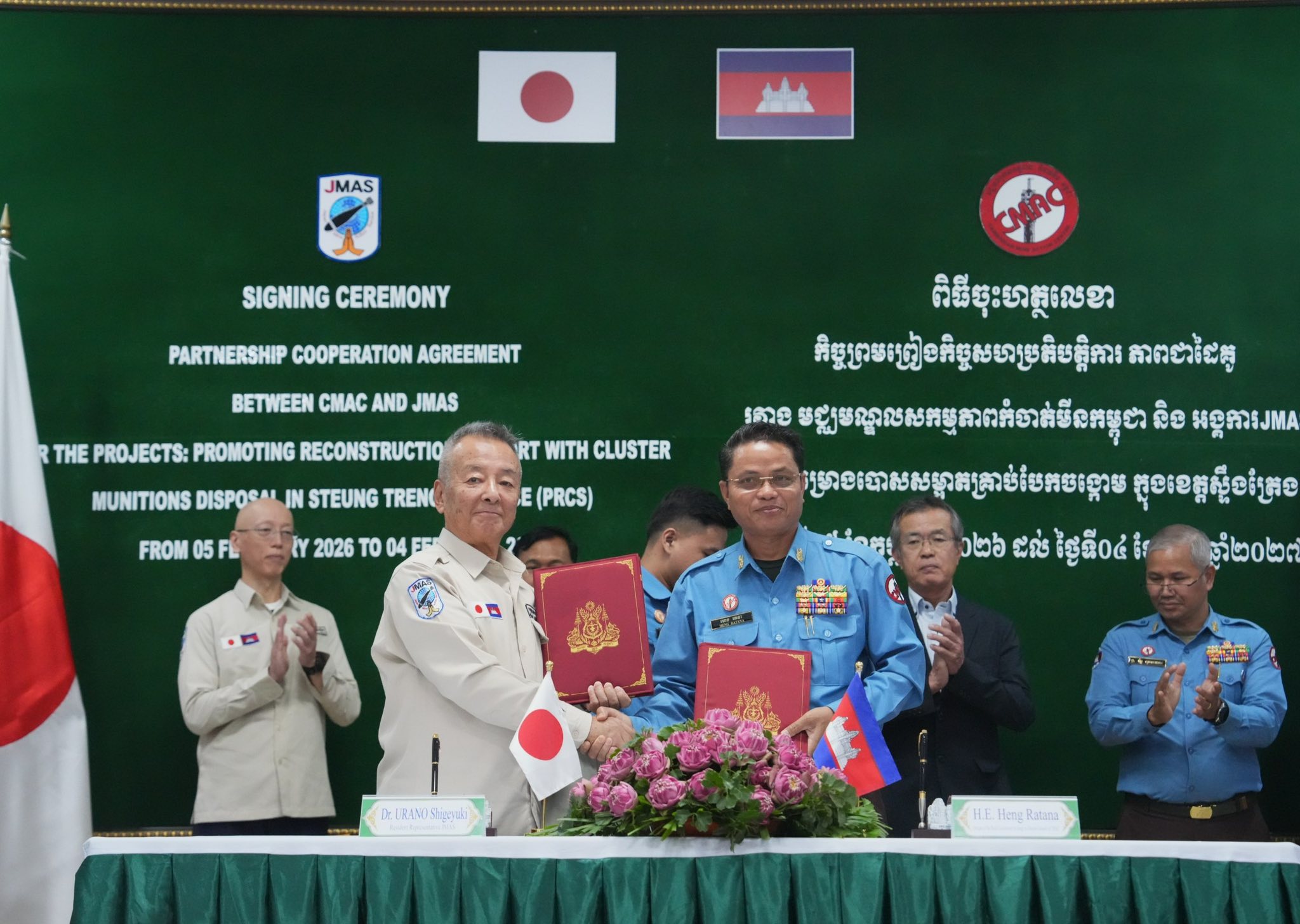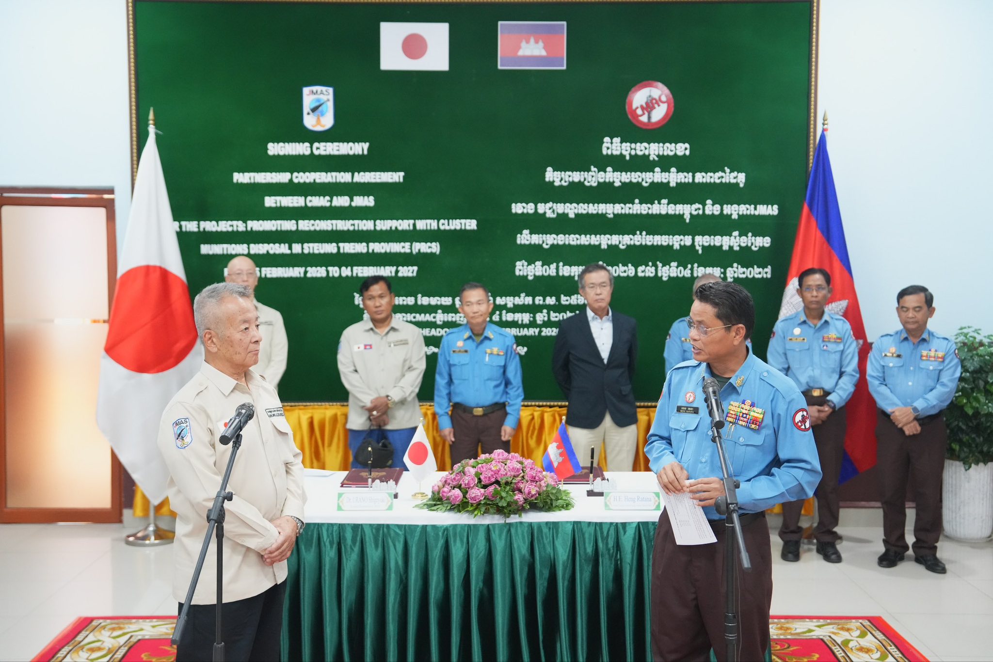 ឯកឧត្តម ហេង រតនា អគ្គនាយកស៊ីម៉ាក់ បានឲ្យដឹងថា នៅរសៀលថ្ងៃទី៤ ខែកុម្ភៈ ឆ្នាំ២០២៦ នៅទីបញ្ជាការស៊ីម៉ាក់ភ្នំពេញ ឯកឧត្តម និងលោកបណ្ឌិត UNRAN Shigeyuki ប្រធានអង្គការ JMAS ប្រចាំកម្ពុជា បានចុះហត្ថលេខាលើកិច្ចសហប្រតិ បត្តិការភាពជាដៃគូ រវាងមជ្ឈមណ្ឌលសកម្មភាពកម្ចាត់មីនកម្ពុជា និងអង្គការ JMAS ក្នុងការអនុវត្តគម្រោងបោសសម្អាត គ្រាប់បែកចង្កោម សម្រាប់រយៈពេល១២ខែ ពីថ្ងៃទី០៥ ខែកុម្ភៈ ឆ្នាំ២០២៦ ដល់ថ្ងៃទី០៤ ខែកុម្ភៈ ឆ្នាំ២០២៧ ដែលនឹងត្រូវបោសសម្អាតគ្រាប់បែកចង្កោមលើផ្ទៃដីទំហំប្រមាណជាង៣០០ហិកតា ស្ថិតក្នុងភូមិសាស្ត្រខេត្តស្ទឹងត្រែង ដែលមានថវិកាគម្រោងចំនួន១៨៤.៤៧១ដុល្លារសហរដ្ឋអាមេរិក និងថវិកាក្នុងគម្រោងមួយចំនួនទៀត អង្គការ JMAS ជួយអភិវឌ្ឍន៍សហគមន៍ ដោយផ្ទាល់ ។