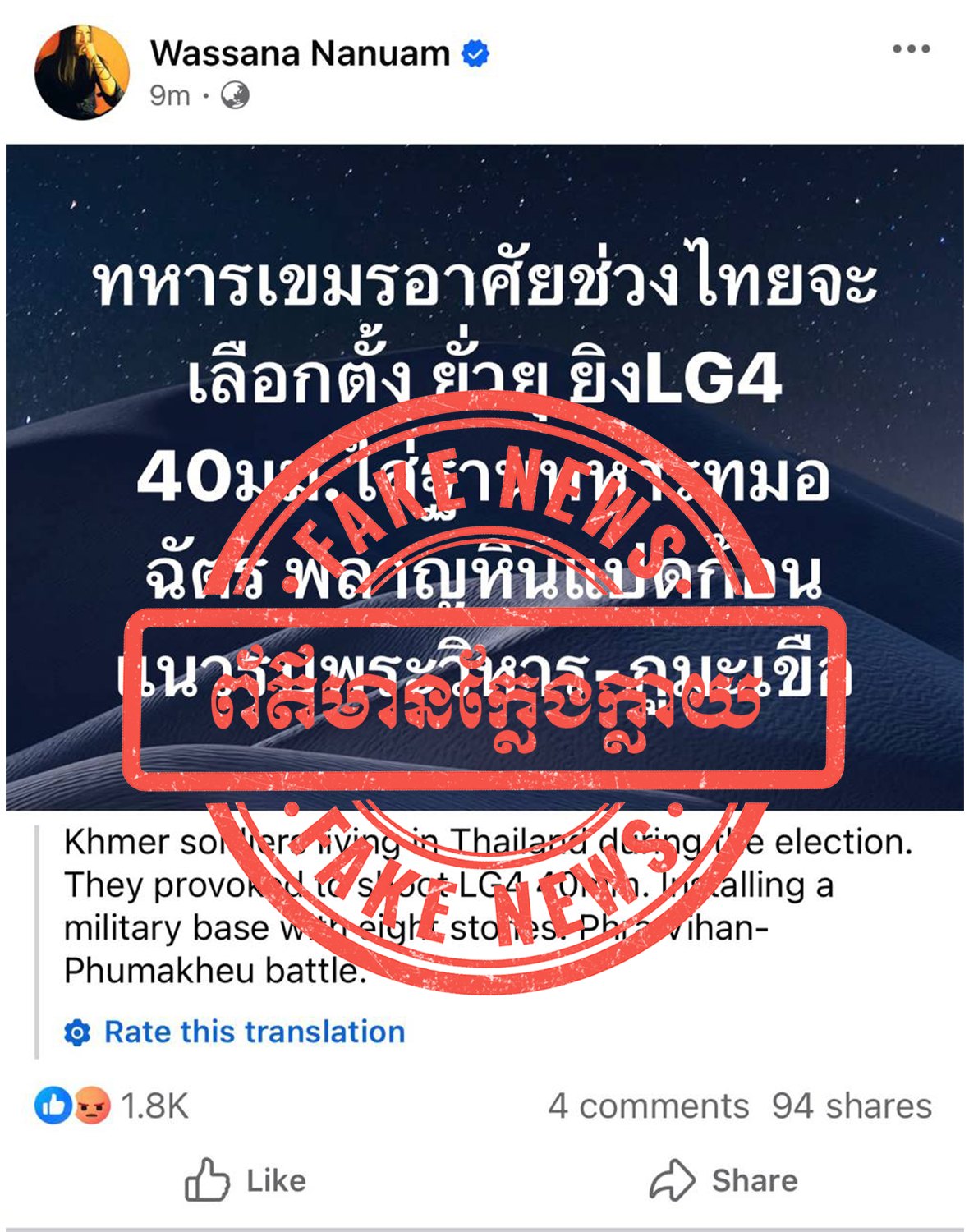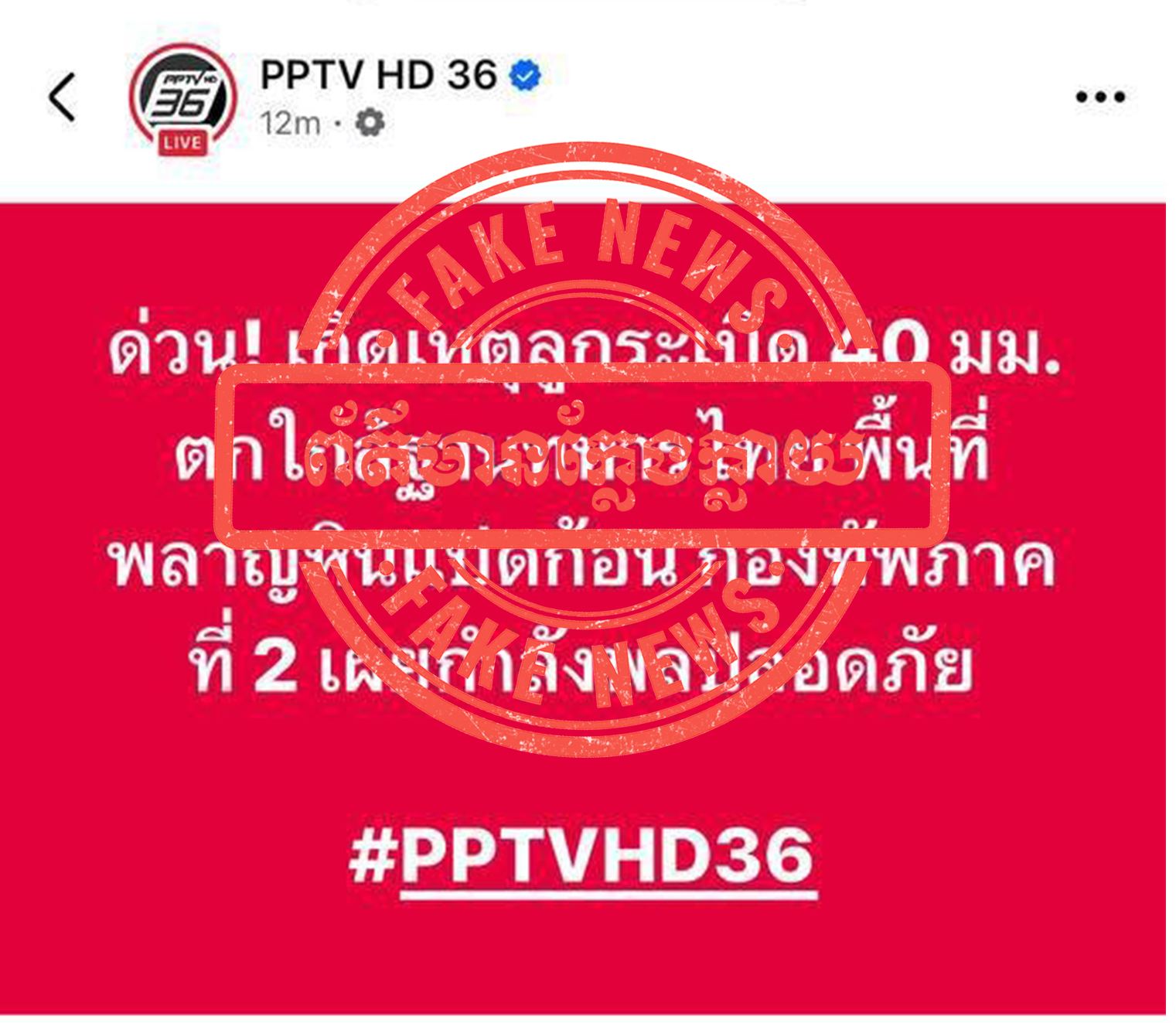 ជាមួយគ្នានេះ ក្រសួងការពារជាតិ សូមអំពាវនាវដល់សាធារណជន និងអ្នកសារព័ត៌មានទាំងអស់ សូមកុំចែករំលែកនូវព័ត៌មានក្លែងក្លាយដែលបានផ្សព្វផ្សាយដោយសារព័ត៌មានថៃខាងលើ ដោយតាមដាន និងទទួលយកតែព័ត៌មានដែលមានប្រភពច្បាស់លាស់ ត្រឹមត្រូវ និងជឿទុកចិត្តបាន ជាពិសេសការផ្តល់ជូនព័ត៌មានដោយរាជរដ្ឋាភិបាល ទំព័រផ្លូវការរបស់ថ្នាក់ដឹកនាំ ក្រសួង និងអង្គភាពពាក់ព័ន្ធរបស់យើង ៕