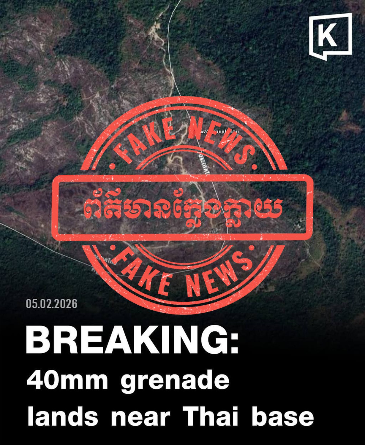 លោកជំទាវ ឧត្តមសេនីយ៍ឯក ម៉ាលី សុជាតា អ្នកនាំពាក្យក្រសួងការពារជាតិ នៃព្រះរាជាណាចក្រកម្ពុជា បានលើកឡើថា នៅថ្ងៃទី៥ ខែកុម្ភៈ ឆ្នាំ២០២៦នេះ មានបណ្តាញសារព័ត៌មានថៃ មួយចំនួន បានផ្សព្វផ្សាយថា “បន្ទាន់! កងទ័ពភូមិភាគទី២ បានរកឃើញថា ភាគីម្ខាងទៀត បានបាញ់គ្រាប់បែក ៤០មីលីម៉ែត្រ ធ្លាក់នៅក្បែរមូលដ្ឋានទាហាន Phlan Hin Pet Kon” អ្នកនាំពាក្យក្រសួងការពារជាតិ នៃព្រះរាជាណាចក្រកម្ពុជា សូមធ្វើការបដិសេធចោលទាំងស្រុង នូវការចុះផ្សាយរបស់បណ្តាញសារព័ត៌មានថៃខាងលើ និងសូមអះអាងថាជាព័ត៌មានប្រឌិត ក្លែងក្លាយផ្ទុយពីការពិតទាំងស្រុង ក្នុងគោលបំណងបំភាន់ដល់សាធារណមតិ និងធ្វើឱ្យស្ថានការណ៍នៅតាមបណ្តោយព្រំដែនកម្ពុជា-ថៃ មានភាពតានតឹង ។