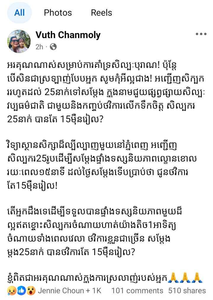 សំណេរដែលអ្នកស្រីបានសរសេរបង្ហោះនោះបានឲ្យដឹងថា អរគុណណាស់សម្រាប់ការគាំទ្រសិល្បៈបុរាណ ប៉ុន្តែបើសិនជាស្រឡាញ់បែបអ្នក សូមកុំអីល្អជាង! អញ្ជើញសិល្បកររហូតដល់25នាក់ទៅសម្តែង ក្នុងនាមជួយផ្សព្វផ្សាយសិល្បៈវប្បធម៌ជាតិ ជាមួយនិងកញ្ចប់ថវិកាលើកទឹកចិត្ត សិល្បករចំនួន25នាក់ បានតែ15ម៉ឺនរៀល? ។