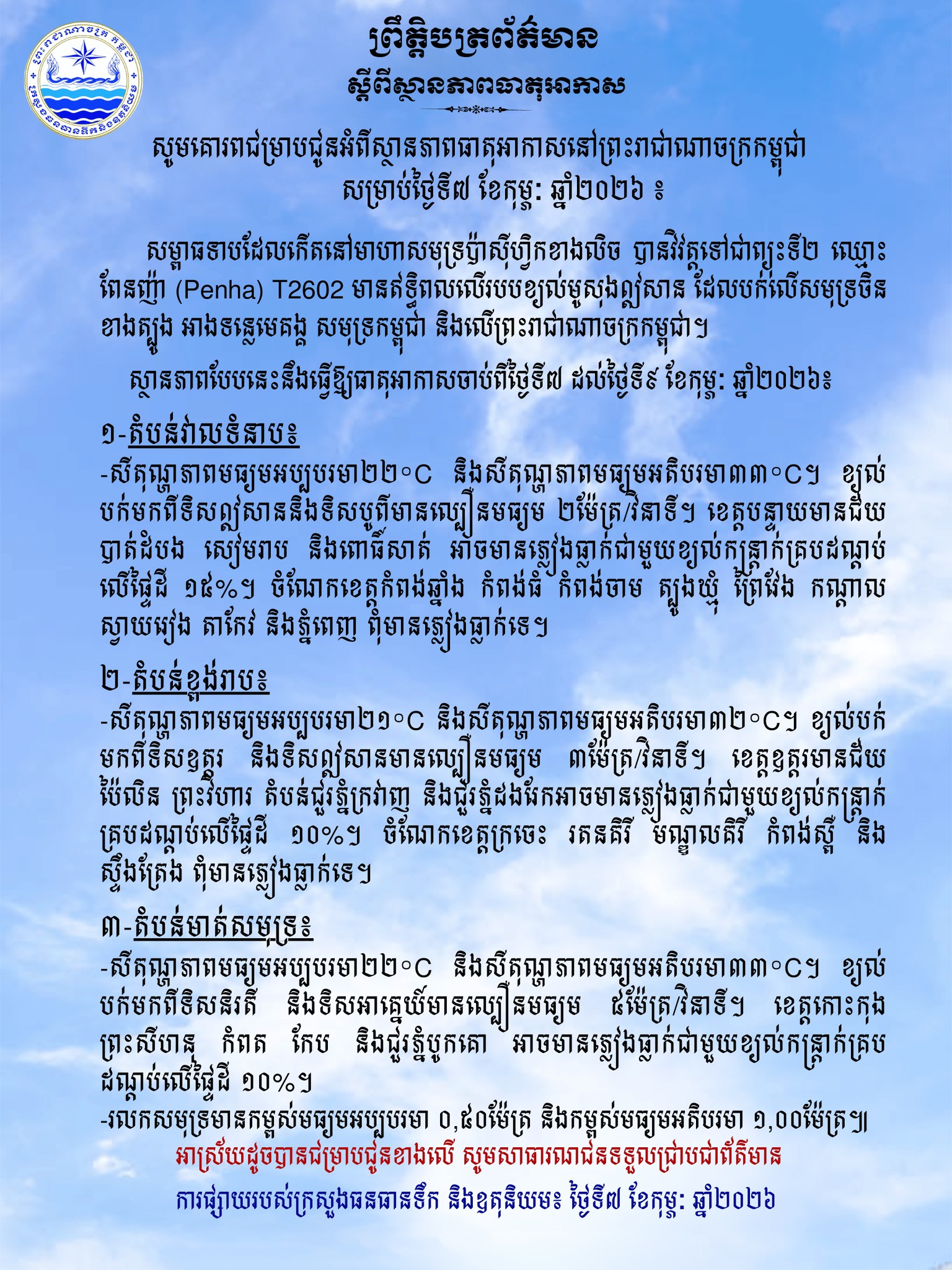 រាជធានីភ្នំពេញ៖ យោងតាមការព្យាករធាតុអាកាសរបស់ក្រសួងធនធានទឹក និងឧតុនិយម បានឱ្យដឹងថា ចាប់ពីថ្ងៃទី៧ ដល់ថ្ងៃទី៩ ខែកុម្ភៈ ឆ្នាំ២០២៦ តំបន់មាត់សមុទ្រដែលរួមមានខេត្តកោះកុង ព្រះសីហនុ កំពត កែប និងតំបន់ជួរភ្នំបូកគោ នឹងបន្តមានភ្លៀងធ្លាក់លាយឡំជាមួយខ្យល់កន្ត្រាក់ក្នុងកម្រិតផ្ទៃដី ១០%។
