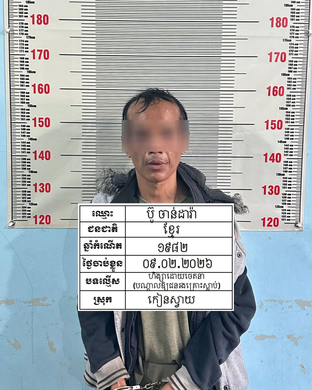 លោកបានឲ្យដឹងថា ជនសង្ស័យត្រូវបានកម្លាំង នៃអធិការដ្ឋានស្រុកកៀនស្វាយឃាត់ខ្លួន កាលពីវេលាម៉ោង០២ និង១០នាទីរសៀលថ្ងៃទី០៩ ខែកុម្ភៈ ឆ្នាំ២០២៦ នៅម្តុំជញ្ជីងថ្លឹងរថយន្ត ស្ថិតក្នុងភូមិតាព្រហ្ម សង្កាត់ព្រែកឯង ខណ្ឌច្បារអំពៅ រាជធានីភ្នំពេញ បន្ទាប់ពីធ្វើសកម្មភាពទាញជីដូនចាស់ជរា ទម្លាក់ពីលើគ្រែ និងវាយដំរហូតដល់ស្លាប់បាន១ថ្ងៃ ។