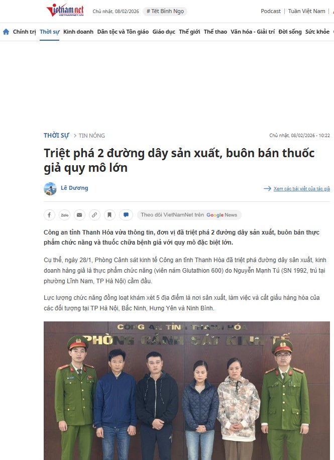 វៀតណាម ៖ តាមរយៈប្រតិបត្តិការបង្ក្រាបទ្រង់ទ្រាយធំមួយ កម្លាំងនគរបាលសេដ្ឋកិច្ចនៃខេត្តថាញ់ហ្វា (Thanh Hoa) សហការជាមួយក្រសួងនគរបាលវៀតណាម បានវាយបំបែកសំបុកក្រុមផលិត និងចែកចាយផលិតផល តាមអនឡាញខ្នាតយក្សចំនួន ២កន្លែង ដែលបានចែកចាយឱសថ និងអាហារបំប៉នក្លែងក្លាយផ្ទុកសារធាតុហាមឃាត់ បង្កគ្រោះថ្នាក់ដល់ជីវិតអ្នកប្រើប្រាស់នៅទូទាំងប្រទេស ។