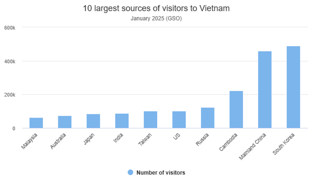 ជាមួយគ្នាដែរ ប្រទេសកូរ៉េខាងត្បូងបានវ៉ាដាច់ចិនដីគោក ក្លាយជាប្រភពទេសចរណ៍កំពូលរបស់ប្រទេសវៀតណាម ជាមួយចំនួនជិត ៤៩០ ០០០ នាក់។ ចិនដីគោកឈរនៅចំណាត់ថ្នាក់ទី ២ ចំនួន ៤៦០ ០០០ នាក់។ ចំណែករុស្ស៊ីជាប់ចំណាត់ថ្នាក់លេខ៤ បន្ទាប់មកគឺសហរដ្ឋអាមេរិក៕