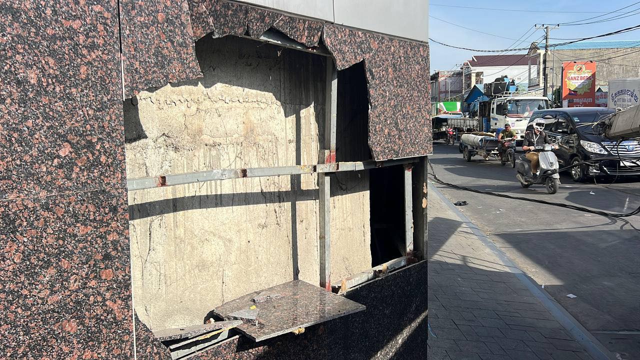 រថយន្តស្ទូចដឹកដែក បើកកៀរបង្គោលភ្លើង បាក់វ័ធត្រូវជញ្ជាំងធនាគារ