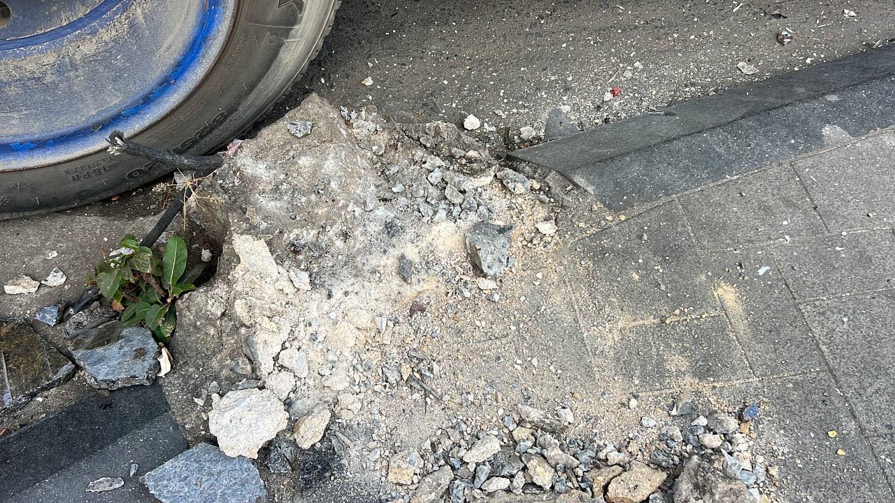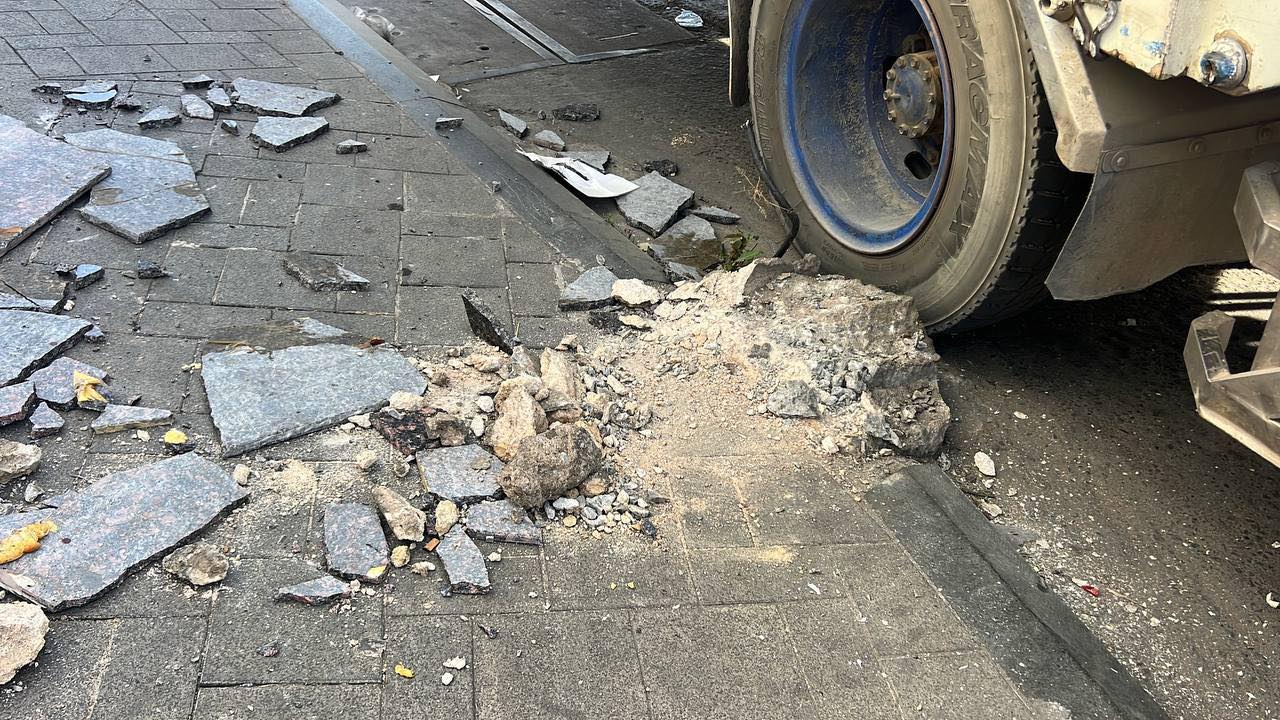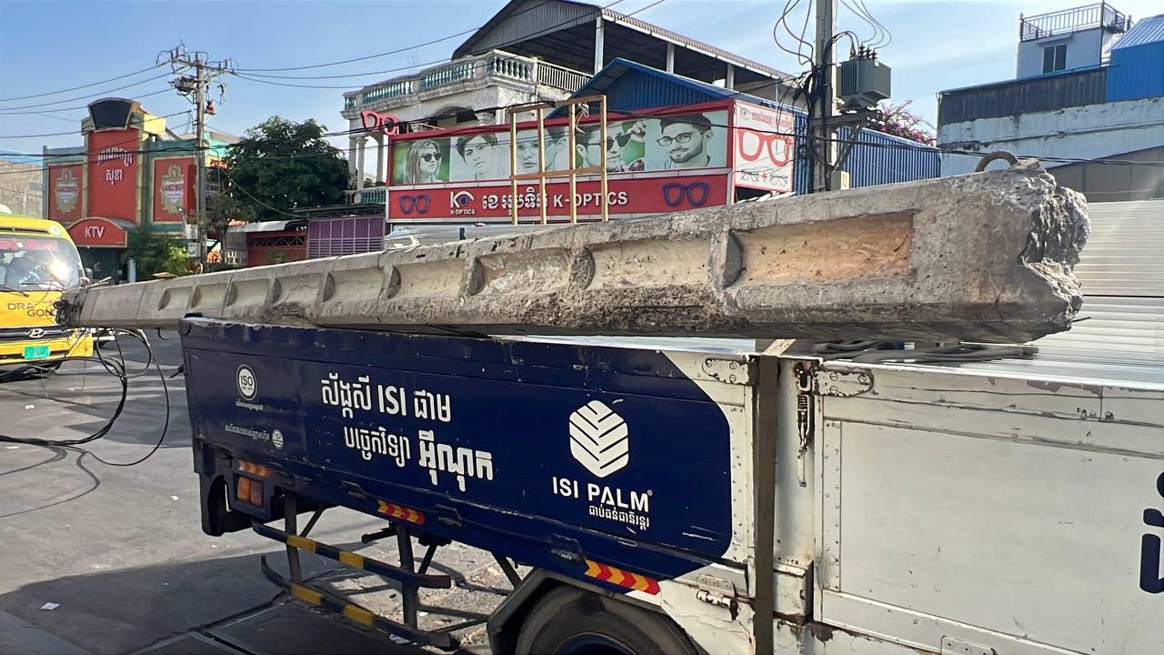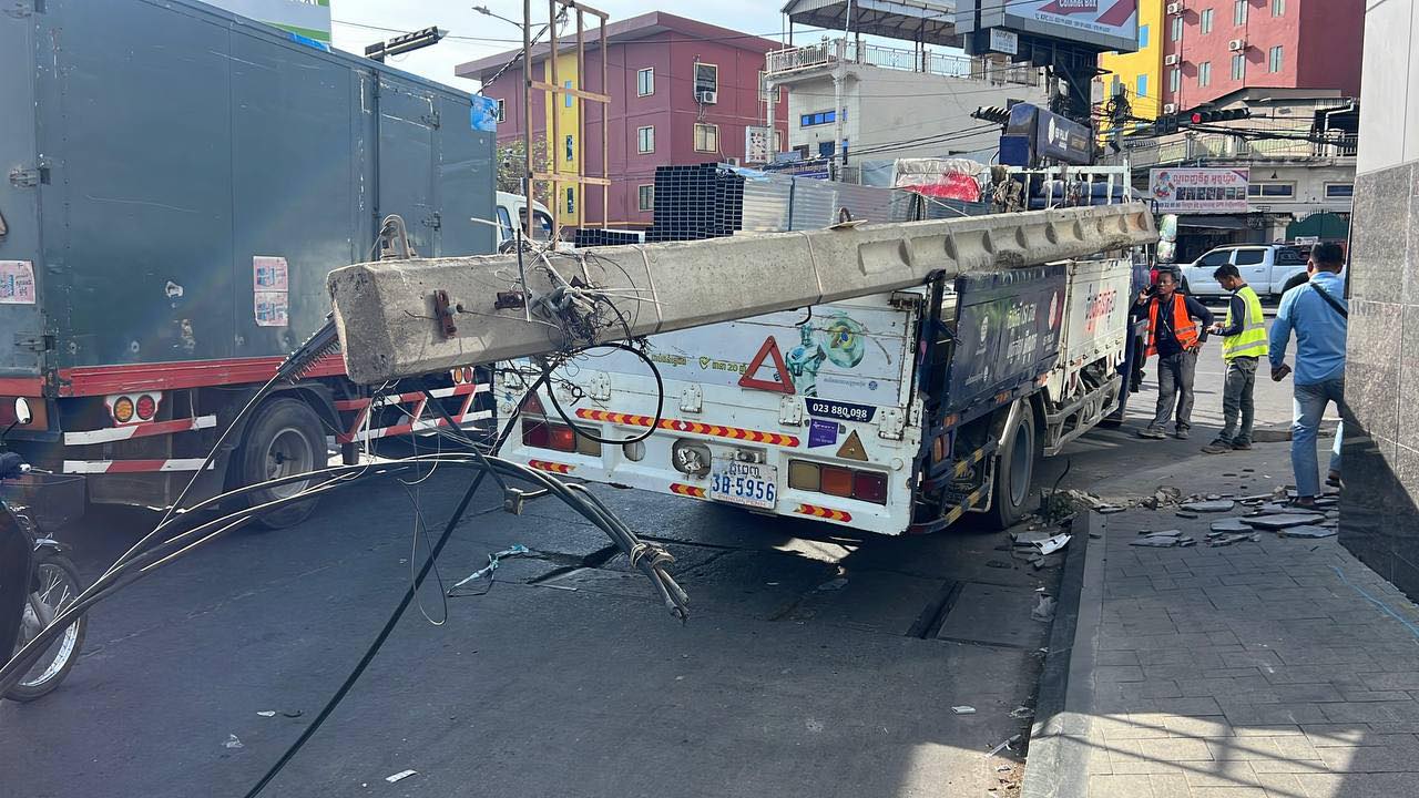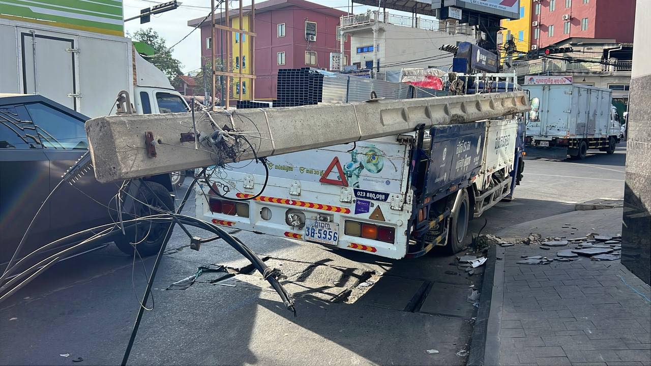 រាជធានីភ្នំពេញ ៖ រថយន្តស្ទូចដឹកដែក ១គ្រឿង របស់ក្រុមហ៊ុន ISI PALM បានបើកកៀរបង្គោលភ្លើងថ្ម ១ដើម បណ្ដាលឲ្យបាក់ដាច់ត្រឹមគល់ ហើយគល់បង្គោលភ្លើងនោះបានខ្ទាតវ័ធ ត្រូវថ្មម៉ាបជញ្ជាំងធនាគារមួយ ស្ថិតនៅក្បែរនោះ បែកធ្លាក់រាយប៉ាយពេញផ្លូវ និងដាច់ខ្សែភ្លើងផងដែរ បន្ទាប់មកទើបបង្គោលភ្លើងខាងលើនោះដួលសង្កត់ទ្រង់រថយន្តស្ទូចតែម្ដង ។
