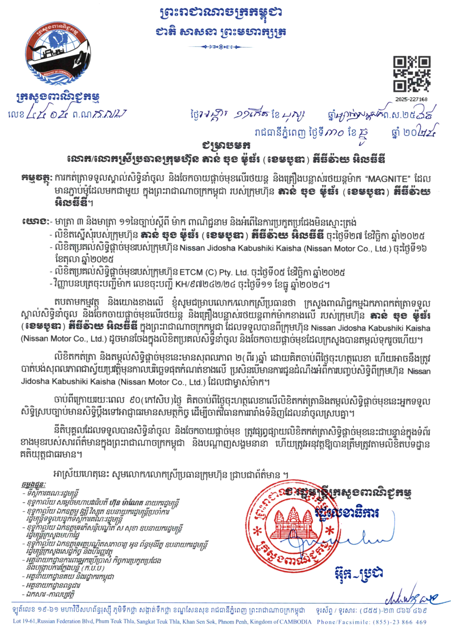 រាជធានីភ្នំពេញ ៖ យោងតាមមាត្រា ៣ និងមាត្រា ១១ នៃច្បាប់ស្តីពី ម៉ាកពាណិជ្ជនាម និងអំពីនៃការប្រកួតប្រជែងមិនស្មោះត្រង់ និងយោងតាមលិខិតស្នើសុំរបស់ ក្រុមហ៊ុន តាន់ ចុង ម៉ូធ័រ (ខេមបូឌា) ភីធីវ៉ាយ អិលធីឌី (Tan Chong Motor (Cambodia) Pty. Ltd.) ចុះថ្ងៃទី ២៧ ខែវិច្ឆិកា ឆ្នាំ ២០២៥, ក្រសួងពាណិជ្ជកម្ម នៃព្រះរាជាណាចក្រកម្ពុជា បានឯកភាពកត់ត្រាទទួលស្គាល់សិទ្ធិនាំចូល និងចែកចាយផ្តាច់មុខលើរថយន្ត និងគ្រឿងបន្លាស់រថយន្តម៉ាក “MAGNITE” របស់ ក្រុមហ៊ុន តាន់ ចុង ម៉ូធ័រ (ខេមបូឌា) ភីធីវ៉ាយ អិលធីឌី ដែលទទួលបានពីក្រុមហ៊ុន Nissan Jidosha Kabushiki Kaisha (Nissan Motor Co., Ltd.) និងក្រុមហ៊ុន ETCM (C) Pty. Ltd. តាមរយៈលិខិតប្រកាសលេខ៖ ៤៥០៥ ព.ណ កសប របស់ ក្រសួងពាណិជ្ជកម្ម នៃព្រះរាជាណាចក្រកម្ពុជា ចុះថ្ងៃទី ៣០ ខែធ្នូ ឆ្នាំ ២០២៥ ។