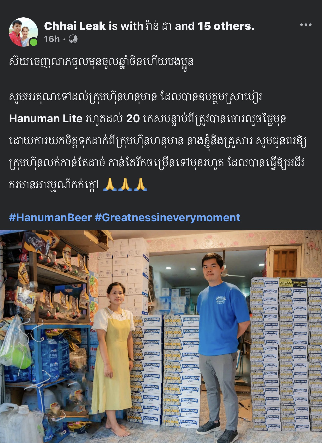 “ស៊យចេញលាភចូលមុនចូលឆ្នាំចិនហើយបងប្អូន សូមអរគុណទៅដល់ក្រុមហ៊ុនហនុមាន ដែលបានឧបត្ថមស្រាបៀរ Hanuman Lite រហូតដល់ 20 កេសបន្ទាប់ពីត្រូវបានចោរលួចថ្ងៃមុន ដោយការយកចិត្តទុកដាក់ពីក្រុមហ៊ុនហនុមាន នាងខ្ញុំនិងគ្រួសារ សូមជូនពរឱ្យក្រុមហ៊ុនលក់កាន់តែដាច់ កាន់តែរីកចម្រើនទៅមុខរហូត ដែលបានធ្វើឱ្យអជីវករមានអារម្មណ៍កក់ក្តៅ” ។