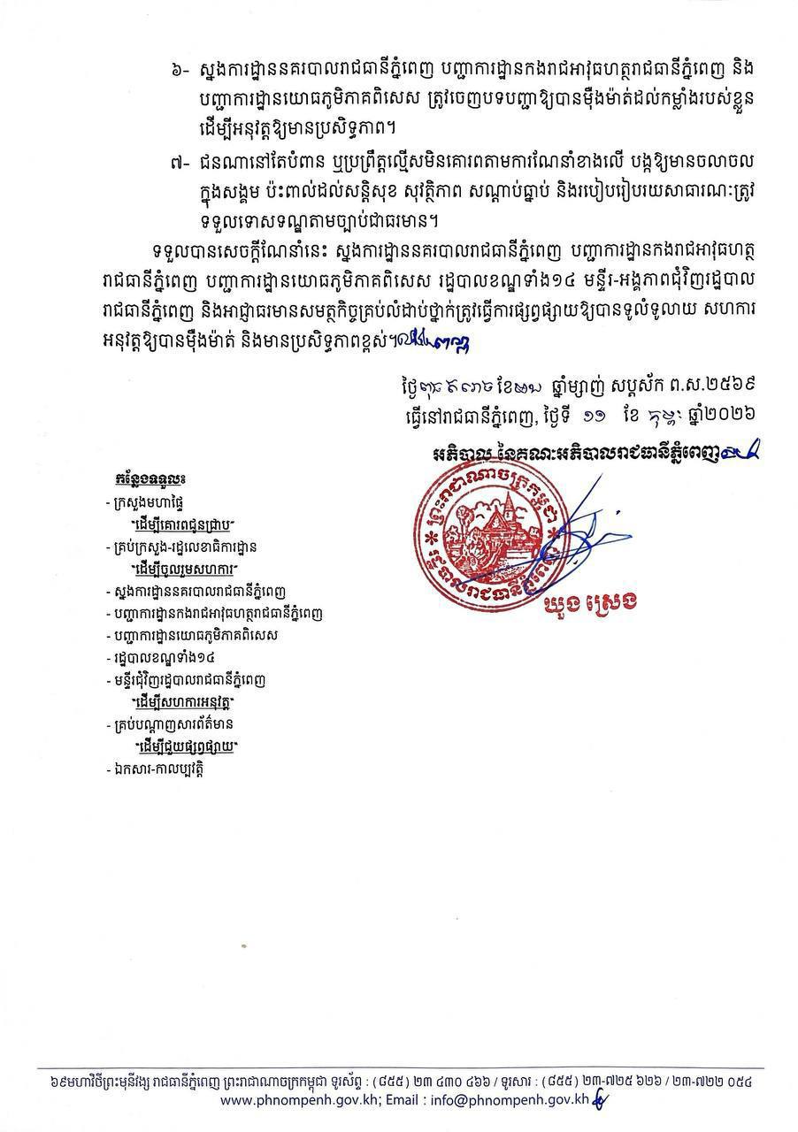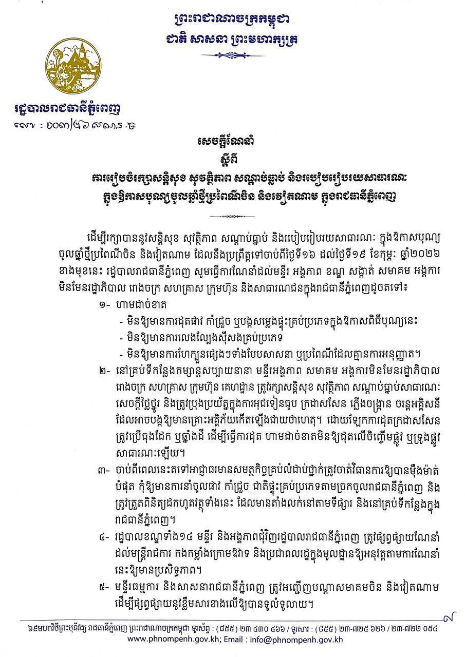 រាជធានីភ្នំពេញ ៖ យោងតាមសេចក្តីប្រកាសព័ត៌មានរបស់រដ្ឋបាលរាជធានីភ្នំពេញ បានឱ្យដឹងថា ដើម្បីរក្សាបាន នូវសន្តិសុខ សុវត្ថិភាព សណ្តាប់ធ្នាប់ និងរបៀបរៀបរយសាធារណៈ ក្នុងឱកាសបុណ្យ ចូលឆ្នាំថ្មីប្រពៃណីចិន និងវៀតណាម ដែលនឹងប្រព្រឹត្តទៅចាប់ពីថ្ងៃទី១៦ ដល់ថ្ងៃទី១៩ ខែកុម្ភៈ ឆ្នាំ២០២៦ ខាងមុខនេះ រដ្ឋបាលរាជធានីភ្នំពេញ សូមធ្វើការណែនាំដល់មន្ទីរ អង្គភាព ខណ្ឌ សង្កាត់ សមាគម អង្គការ មិនមែនរដ្ឋាភិបាល រោងចក្រ សហគ្រាស ក្រុមហ៊ុន និងសាធារណជន ក្នុងរាជធានីភ្នំពេញ ដូចតទៅ ៖