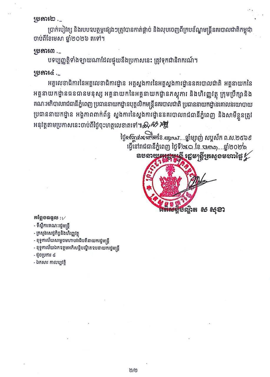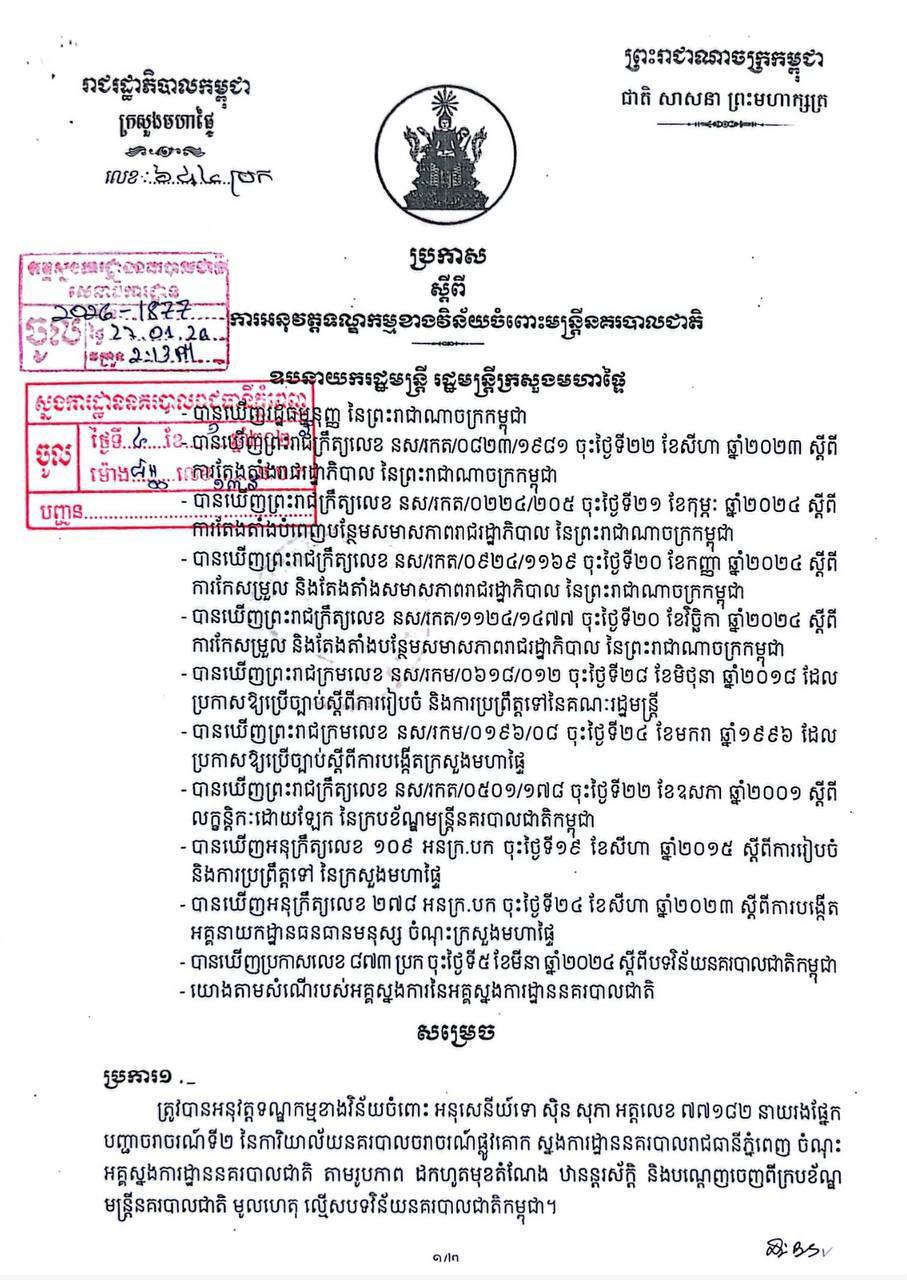 រាជធានីភ្នំពេញ ៖ មន្ត្រីនគរបាលម្នាក់ឈ្មោះ ស៊ិន សុភា អត្តលេខ ៧៧១៨២ ជានាយរងផ្នែកបញ្ជាចរាចរណ៍ទី២ នៃការិយាល័យនគរបាលចរាចរណ៍ផ្លូវគោក ស្នងការដ្ឋាននគរបាលរាជធានីភ្នំពេញ ល្មើសបទវិន័យកងកម្លាំងនគរបាលជាតិកម្ពុជា ត្រូវបានក្រសួងមហាផ្ទៃ សម្រេចអនុវត្តវិន័យបណ្តេញចេញពីក្របខ័ណ្ឌនគរបាលជាតិ កាលពីថ្ងៃទី២០ ខែមករា ឆ្នាំ២០២៦ ។