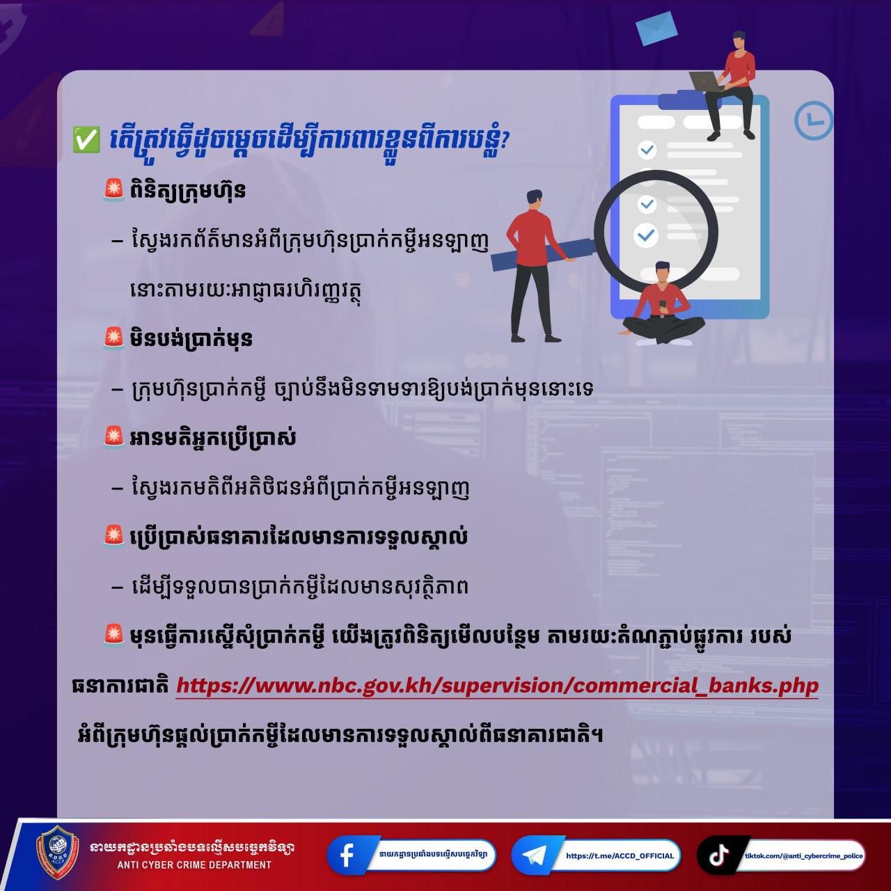 ជាថ្មីម្តងទៀត នាយកដ្ឋានសូមក្រើនរំលឹកដល់សារធារណជន ជាពិសេស អ្នកប្រើប្រាស់ប្រព័ន្ធបណ្តាញទំនាក់ទំនងសង្គម សូមមានការប្រុងប្រយ័ត្នចំពោះការបង្ហោះផ្សព្វផ្សាយពាក់ព័ន្ធ និងការផ្តល់ប្រាក់កម្ចីអនទ្បាញ តាមប្រព័ន្ធបណ្តាញទំនាក់ទំនងសង្គមនានា ជាពិសេសតាមទំព័រហ្វេសប៊ុក និងតេលេក្រាម ដែលបានបង្ហោះផ្សព្វផ្សាយផ្តល់ប្រាក់កម្ចីអនឡាញ ក្រោមល័ក្ខខ័ណ្ឌដាក់ស្នើកម្ចីងាយស្រួលក្នុងគោលបំណងទាក់ទាញអោយប្រជាពលរដ្ឋមានចំណាប់អារម្មណ៍ និងដាក់ស្នើកម្ចីអនឡាញ ។