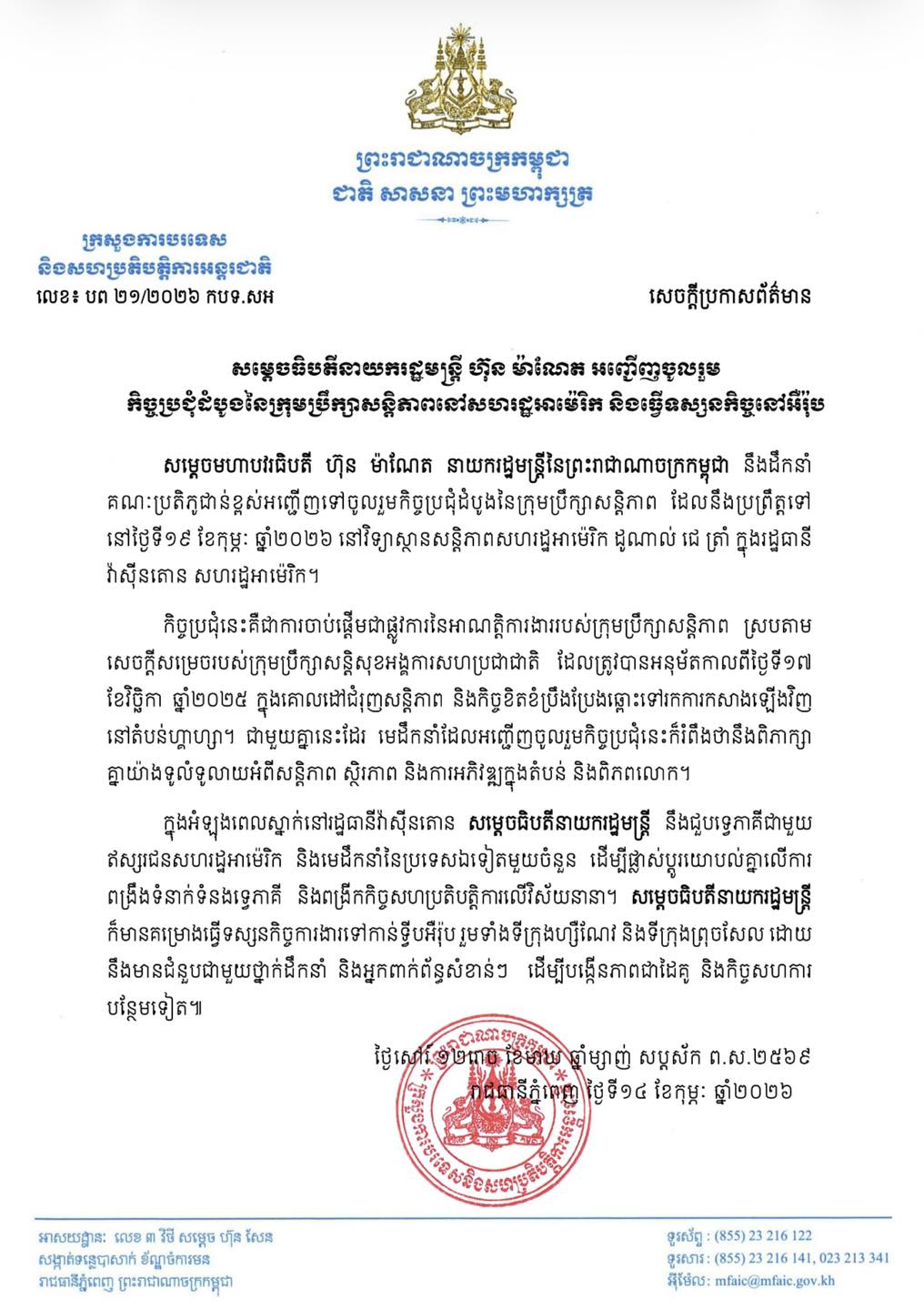 រាជធានីភ្នំពេញ ៖ សម្តេចមហាបវរធិបតី ហ៊ុន ម៉ាណែត នាយករដ្ឋមន្ត្រីនៃព្រះរាជាណាចក្រកម្ពុជា នឹងដឹកនាំគណៈប្រតិភូជាន់ខ្ពស់ អញ្ជើញទៅចូលរួមកិច្ចប្រជុំដំបូងនៃក្រុមប្រឹក្សាសន្តិភាព ដែលនឹងប្រព្រឹត្តទៅ នៅថ្ងៃទី១៩ ខែកុម្ភៈ ឆ្នាំ២០២៦ នៅវិទ្យាស្ថានសន្តិភាពសហរដ្ឋអាម៉េរិក ដូណាល់ ជេ ត្រាំ ក្នុងរដ្ឋធានី វ៉ាស៊ីនតោន សហរដ្ឋអាម៉េរិក ។ នេះបើតាមសេចក្តីប្រកាសព័ត៌មានរបស់ក្រសួងការបទេសនិងសហប្រតិបត្តិការអន្តរជាតិ ។