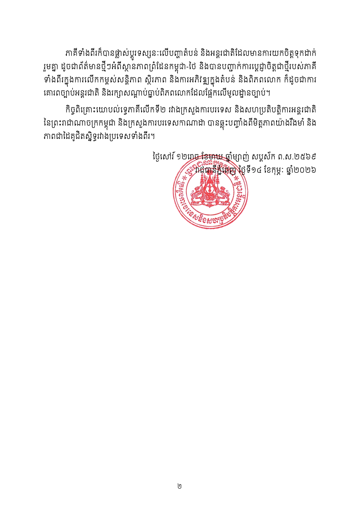 ក្រសួងការបទេសកម្ពុជាបានលើកឡើងថា នៅថ្ងៃទី១២ ខែកុម្ភៈ ឆ្នាំ២០២៦ ឯកឧត្តម មាស គឹមហេង រដ្ឋលេខាធិការនៃក្រសួងការបរទេស និងសហប្រតិបត្តិការអន្តរជាតិនៃព្រះរាជាណាចក្រកម្ពុជា និងឯកឧត្តម អាឡិន បូមែន អគ្គនាយកទទួលបន្ទុកកិច្ចការអាស៊ីអាគ្នេយ៍ និងអូសេអានីនៃក្រសួងការបរទេសកាណាដា បានអញ្ជើញធ្វើជាសហប្រធាននៃកិច្ចពិគ្រោះយោបល់ទ្វេភាគីកម្ពុជា-កាណាដាលើកទី២ ប្រកបដោយជោគជ័យនៅរាជធានីភ្នំពេញ ។