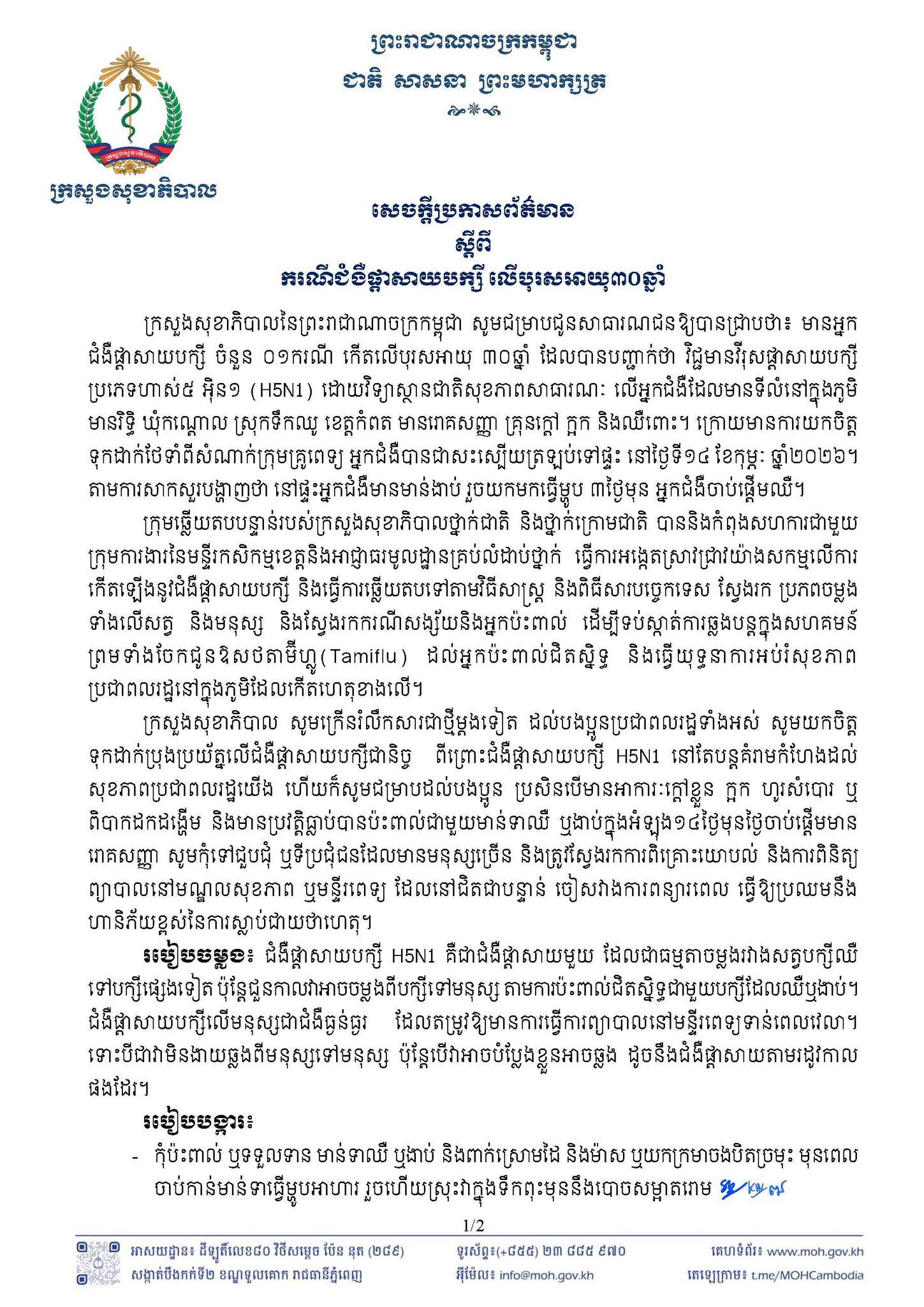 រាជធានីភ្នំពេញ ៖ ក្រសួងសុខាភិបាល នៃព្រះរាជាណាចក្រកម្ពុជា បានសេចក្តីប្រកាសព័ត៌មាននៅថ្ងៃទី១៤ កុម្ភៈ ២០២៦នេះថា ៖ មានអ្នកជំងឺផ្តាសាយបក្សី ចំនួន ០១ករណី កើតលើបុរសអាយុ ៣០ឆ្នាំ ដែលបានបញ្ជាក់ថា វិជ្ជមានវីរុសផ្តាសាយបក្សី ប្រភេទ ហាស់៥ អ៊ិន១ (H5N1) ដោយវិទ្យាស្ថានជាតិសុខភាពសាធារណៈ លើអ្នកជំងឺដែលមានទីលំនៅក្នុងភូមិ មានរិទ្ធិ ឃុំកណ្តោល ស្រុកទឹកឈូ ខេត្តកំពត មានរោគសញ្ញា គ្រុនក្តៅ ក្អក និងឈឺពោះ។ ក្រោយមានការយកចិត្ត ទុកដាក់ថែទាំពីសំណាក់ក្រុមគ្រូពេទ្យ អ្នកជំងឺបានជាសះស្បើយត្រឡប់ទៅផ្ទះនៅថ្ងៃទី១៤ ខែកុម្ភៈ ឆ្នាំ២០២៦។ តាមការសាកសួរបង្ហាញថា នៅផ្ទះអ្នកជំងឺមានមាន់ងាប់ រួចយកមកធ្វើម្ហូប ៣ថ្ងៃមុន អ្នកជំងឺចាប់ផ្ដើមឈឺ ។