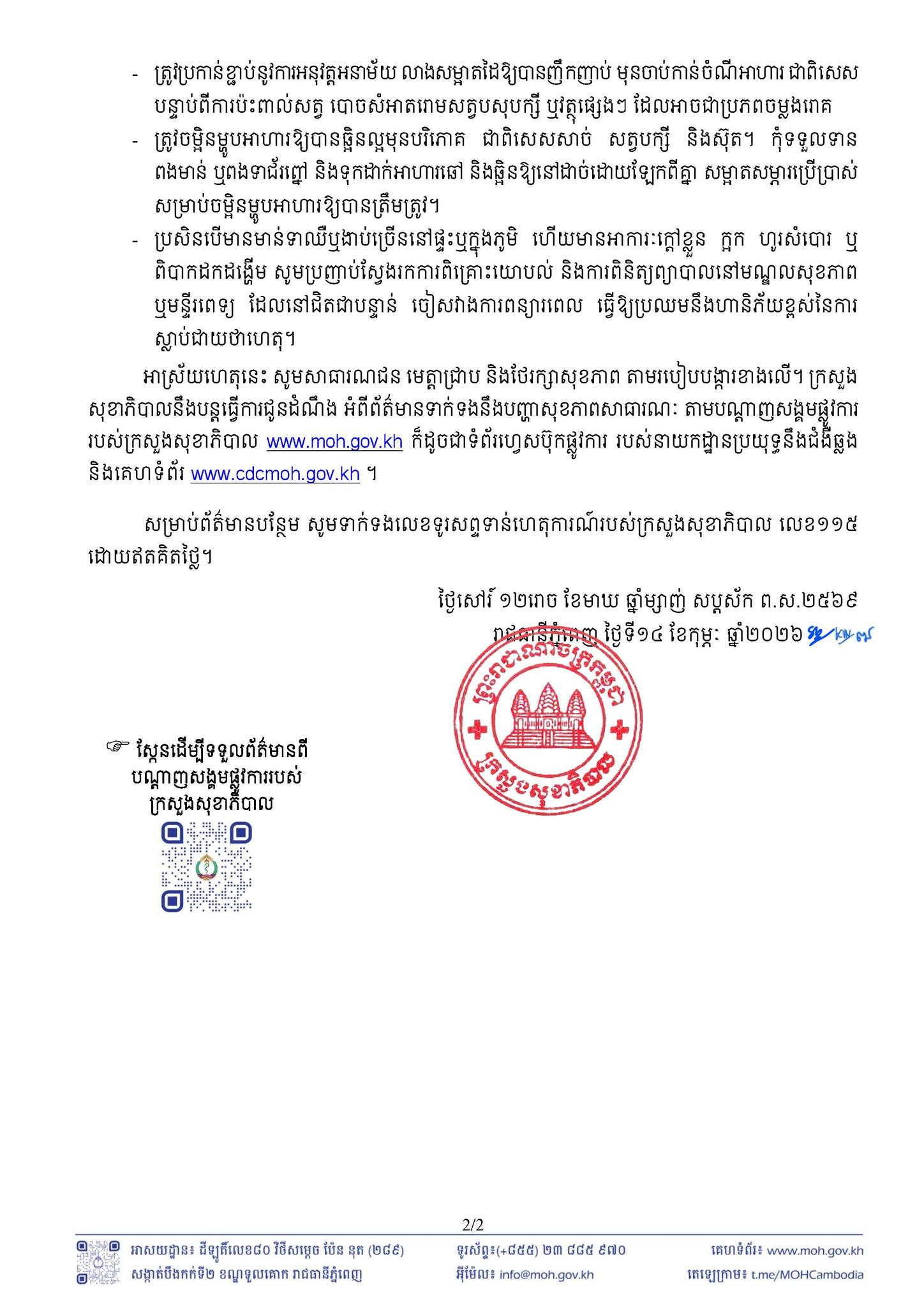 អាស្រ័យហេតុនេះ សូមសាធារណជន មេត្តាជ្រាប និងថែរក្សាសុខភាព តាមរបៀបបង្ការខាងលើ ។ សម្រាប់ព័ត៌មានបន្ថែម សូមទាក់ទងលេខទូរសព្ទទាន់ហេតុការណ៍របស់ក្រសួងសុខាភិបាល លេខ១១៥ ដោយឥតគិតថ្លៃ ៕