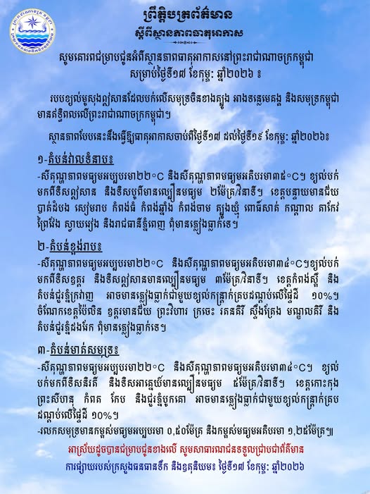 ចំពោះស្ថានភាពទូទៅ សីតុណ្ហភាពមធ្យមអប្បបរមាមានកម្រិត ២២°C និងអតិបរមាអាចឡើងដល់ ៣៤°C។ ខ្យល់នឹងបក់មកពីទិសនិរតី និងទិសអាគ្នេយ៍ ក្នុងល្បឿនមធ្យម ៥ ម៉ែត្រក្នុងមួយវិនាទី។ សម្រាប់បងប្អូនដែលត្រូវធ្វើដំណើរតាមផ្លូវទឹក ឬប្រកបរបរនេសាទ សូមបង្កើនការប្រុងប្រយ័ត្នខ្ពស់ ដោយសាររលកសមុទ្រអាចមានកម្ពស់ចន្លោះពី ០,៥០ ម៉ែត្រ រហូតដល់ ១,២៥ ម៉ែត្រ៕