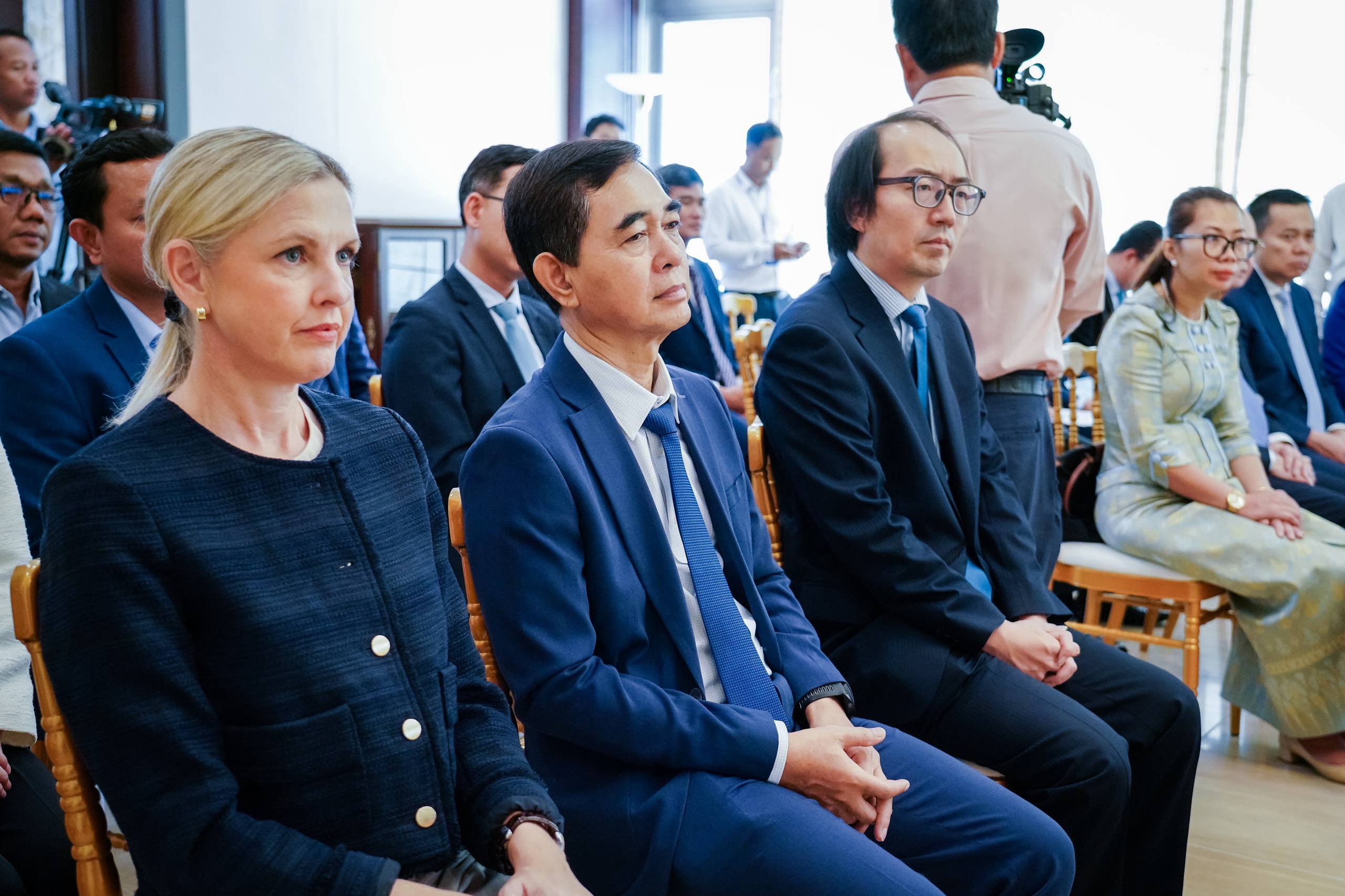 រាជធានីភ្នំពេញ ៖ ឯកឧត្តម ហេង សួរ រដ្ឋមន្ត្រីក្រសួងការងារ និងបណ្តុះបណ្តាលវិជ្ជាជីវៈ បានអញ្ជើញធ្វើជាសក្ខីភាពក្នុងពិធីចុះហត្ថលេខាលើគម្រោងស្តីពី «ការលើកកម្ពស់មុខរបរនិងការងារដល់ពលករចំណាកស្រុកត្រឡប់មកវិញ ដែលរងផលប៉ះពាល់ពីជម្លោះព្រំដែន» ដោយឯកឧត្ដម អ៊ូអិណុ អាត់ស៊ូស៊ី (UENO Atsushi) ឯកអគ្គរាជទូតវិសាមញ្ញ និងពេញសមត្ថភាពរបស់ប្រទេសជប៉ុន ប្រចាំកម្ពុជា និងលោកស្រី ស៊ាវយៀន ឈាន (Xiaoyan Qian) នាយិកាការិយាល័យអង្គការ ILO ប្រចាំកម្ពុជា ឡាវ និងថៃ នាព្រឹកថ្ងៃទី១៨ ខែកុម្ភៈ ឆ្នាំ២០២៦ នៅស្ថានទូតជប៉ុន ។
