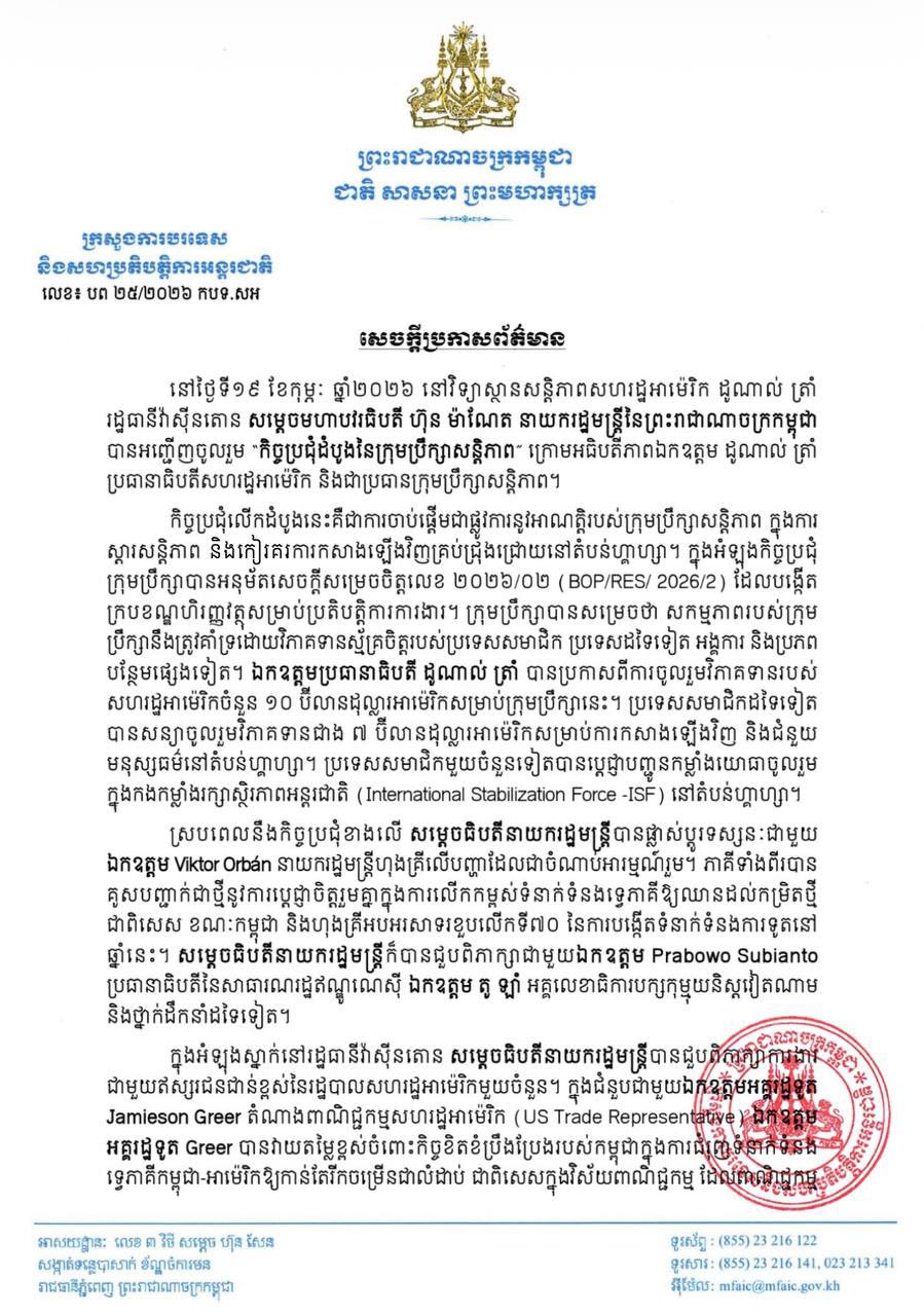 ក្រសួងការបទេសបានលើកឡើងថា នៅថ្ងៃទី១៩ ខែកុម្ភៈ ឆ្នាំ២០២៦ នៅវិទ្យាស្ថានសន្តិភាពសហរដ្ឋអាមេរិក ដូណាល់ ត្រាំ រដ្ឋធានីវ៉ាស៊ីនតោន សម្តេចមហាបវរធិបតី ហ៊ុន ម៉ាណែត នាយករដ្ឋមន្ត្រីនៃព្រះរាជាណាចក្រកម្ពុជា បានអញ្ជើញចូលរួម «កិច្ចប្រជុំដំបូងនៃក្រុមប្រឹក្សាសន្តិភា» ក្រោមអធិបតីភាពឯកឧត្តម ដូណាល់ ត្រាំ ប្រធានាធិបតីសហរដ្ឋអាមេរិក និងជាប្រធានក្រុមប្រឹក្សាសន្តិភាព ។ កិច្ចប្រជុំលើកដំបូងនេះ គឺជាការចាប់ផ្តើមជាផ្លូវការនូវអាណត្តិរបស់ក្រុមប្រឹក្សាសន្តិភាពក្នុងការ ស្តារសន្តិភាព និងកៀរគរការកសាងឡើងវិញគ្រប់ជ្រុងជ្រោយនៅតំបន់ហ្គាហ្សា ។ ក្នុងអំឡុងកិច្ចប្រជុំ ក្រុមប្រឹក្សាបានអនុម័តសេចក្តីសម្រេចចិត្តលេខ ២០២៦/០២ (BOP/RES/ 2026/2) ដែលបង្កើត ក្របខណ្ឌហិរញ្ញវត្ថុសម្រាប់ប្រតិបត្តិការការងារ ។ ក្រុមប្រឹក្សាបានសម្រេចថា សកម្មភាពរបស់ក្រុម ប្រឹក្សានឹងត្រូវគាំទ្រដោយវិភាគទានស្ម័គ្រចិត្តរបស់ប្រទេសសមាជិក ប្រទេសដទៃទៀត អង្គការ និងប្រភពបន្ថែមផ្សេងទៀត ។