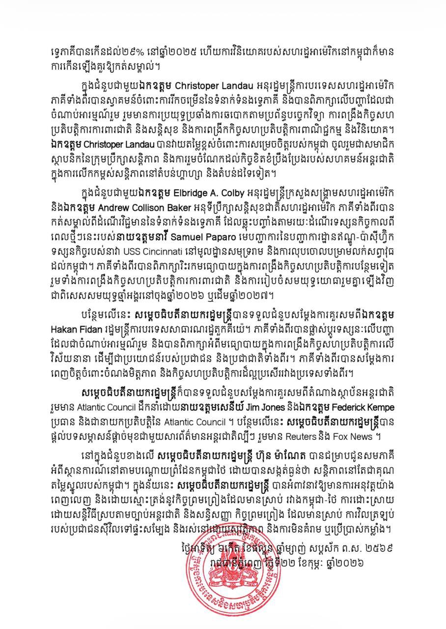 ក្នុងជំនួបជាមួយឯកឧត្តម Christoper Landau អនុរដ្ឋមន្ត្រីការបរទេសសហរដ្ឋអាម៉េរិក ភាគីទាំងពីរបានស្វាគមន៍ចំពោះការរីកចម្រើននៃទំនាក់ទំនងទ្វេភាគី និងបានពិភាក្សាលើបញ្ហាដែលជា ចំណាប់អារម្មណ៍រួម រួមមានការប្រយុទ្ធប្រឆាំងការឆបោកតាមប្រព័ន្ធបច្ចេកវិទ្យា ការពង្រឹងកិច្ចសហ ប្រតិបត្តិការការពារជាតិ និងសន្តិសុខ និងការពង្រីកកិច្ចសហប្រតិបត្តិការពាណិជ្ជកម្ម និងវិនិយោគ ។ ឯកឧត្តម Christoper Landau បានវាយតម្លៃខ្ពស់ចំពោះការសម្រេចចិត្តរបស់កម្ពុជា ចូលរួមជាសមាជិក ស្ថាបនិកនៃក្រុមប្រឹក្សាសន្តិភាព និងការរួមចំណែកដល់កិច្ចខិតខំប្រឹងប្រែងរបស់សហគមន៍អន្តរជាតិ ក្នុងការលើកកម្ពស់សន្តិភាពនៅតំបន់ហ្គាហ្សា និងតំបន់ដទៃទៀត។