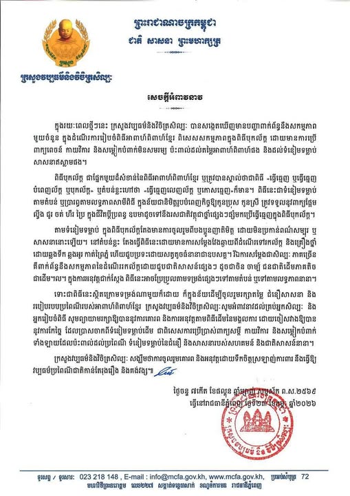 យោងតាមសេចក្ដីអំពាវនាវរបស់ក្រសួងវប្បធម៌ នៅថ្ងៃទី២៣ កុម្ភៈ ឆ្នាំ២០២៦ ថា ក្នុងរយៈពេលថ្មីៗនេះ ក្រសួងវប្បធម៌ និងវិចិត្រសិល្បៈ បានសង្កេតឃើញមានបញ្ហាពាក់ព័ន្ធនឹងសកម្មភាពមួយចំនួន ក្នុងដំណើរការរៀបចំពិធីអាពាហ៍ពិពាហ៍ខ្មែរ ពិសេស សកម្មភាពក្នុងពិធីបុកល័ក្ត ដោយមានការប្រើពាក្យពេចន៍ កាយវិការ និងសម្លៀកបំពាក់មិនសមរម្យ ប៉ះពាល់ដល់តម្លៃអាពាហ៍ពិពាហ៍ផង និងដល់ទំនៀមទម្លាប់ សាសនាឥស្លាមផង ។