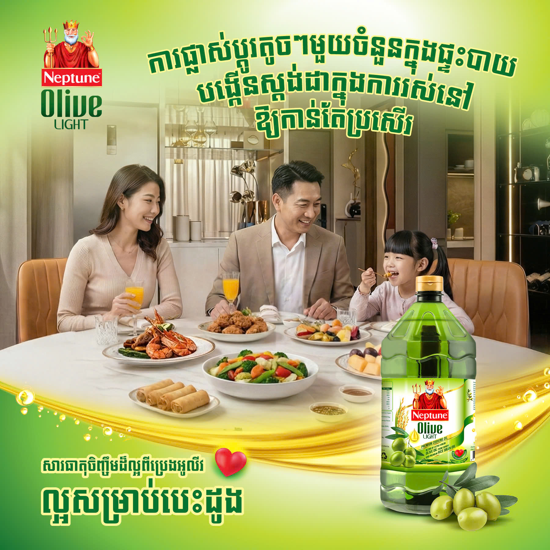 មេផ្ទះកម្ពុជាជាច្រើន បានយល់ដឹងយ៉ាងច្បាស់ថា ប្រេងអូលីវ Extra Virgin មានផ្ទុកនូវសមាសធាតុដែលផ្តល់អត្ថប្រយោជន៍ចំពោះសុខភាព ហើយបានក្លាយជាជម្រើសចម្បងសម្រាប់របបអាហារដ៏មានគុណភាព ។ឆ្លើយតបទៅនឹងតម្រូវការនេះ ប្រេងឆាគុណភាពខ្ពស់ណិបទូនអូលីវឡាយត៍ Neptune Olive Light ត្រូវបានបង្កើតឡើង ។ ប្រេងឆានេះរក្សាទុកនូវអត្ថប្រយោជន៍ទាំងស្រុងរបស់ប្រេងអូលីវ Extra Virgin ប៉ុន្តែនៅតែអាចឆ្លើយតបយ៉ាងល្អឥតខ្ចោះទៅនឹងការចម្អិនអាហារដ៏សម្បូរបែបដូចជា ចៀន ឆា និងបំពង ។ អាថ៌កំបាំងនេះស្ថិតនៅលើរូបមន្តរួមបញ្ចូលគ្នារវាងប្រេងអូលីវ Extra Virgin និងប្រេងកន្ទក់សុទ្ធ ដែលជួយពង្រីកលទ្ធភាពប្រើប្រាស់របស់ប្រេងអូលីវឱ្យកាន់តែទូលំទូលាយសម្រាប់អាហារប្រចាំថ្ងៃ ។