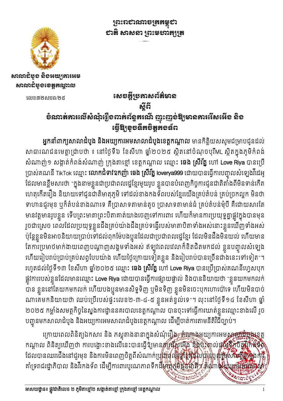 គួរបញ្ជាក់ថា អ្នកនាង ឆេង ស្រីរ័ត្ន ហៅ Love Riya ត្រូវបានចៅក្រមស៉ើបសួរ នៃសាលាដំបូងខេត្តកណ្ដាល សម្រេចឃុំខ្លួនដាក់ពន្ធនាគារជាបណ្ដោះអាសន្ន នៅថ្ងៃទី១៥ ខែសីហា ឆ្នាំ២០២៥ ក្រោយតំណាងអយ្យការសម្រេចចោទប្រកាន់ចំនួន២ បទល្មើស រួមមាន «ញុះញង់ឲ្យប្រព្រឹត្តឧក្រិដ្ឋជាអាទិ៍ និងធ្វើឲ្យខូចទឹកចិត្តកងទ័ព» ប្រព្រឹត្តនៅចំណុចបុរី ML ស្ថិតនៅ ភូមិកំពង់សំណាញ់១ សង្កាត់កំពង់សំណាញ់ ក្រុងតាខ្មៅ ខេត្តកណ្តាល កាលពីថ្ងៃទី៦ និងថ្ងៃទី១៣ ខែសីហា ឆ្នាំ២០២៥ បទល្មើសព្រហ្មទណ្ឌ ដែលចែងឱ្យផ្តន្ទាទោសតាមមាត្រា ៤៧២ និងមាត្រា ៤៩៦ នៃក្រមព្រហ្មទណ្ឌ។