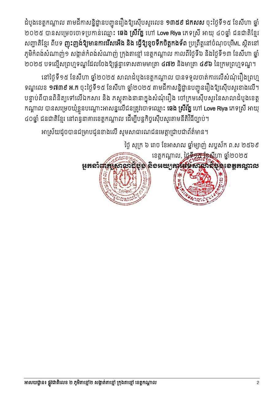 ក្រោយពិនិត្យទៅលើឯកសារ និងភស្តុតាងនានា ក្នុងសំណុំរឿង ចៅក្រមស៊ើបសួរ នៃសាលាដំបូងខេត្តកណ្តាល បានសម្រេចឃុំខ្លួនបណ្តោះអាសន្នលើជនត្រូវចោទឈ្មោះ ឆេង ស្រីរ័ត្ន ហៅ Love Riya ដាក់ឃុំបណ្តោះអាសន្ន នៅពន្ធនាគារខេត្តកណ្តាល ដើម្បីបន្តកិច្ចស៊ើបសួរតាមនីតិវិធីច្បាប់ ។