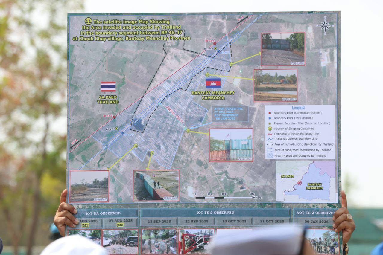 លោកបានបញ្ជាក់ថា នៅពេលដែលប្រតិភូអង្គទូតចុះពិនិត្យជាក់ស្តែង ហើយបានបង្ហាញផែនទីអោយបានដឹងភាគីទាហានថៃ ពិតជារំលោភដែនអធិបតេយ្យភាពកម្ពុជាក្រោយបទឈប់បាញ់គ្នា ហើយបានយកលួសបន្លា និងដាក់កុងតឺន័រព័ទ្ធយកលំនៅឋានប្រជាពលរដ្ឋរហូតចំនួន៦ភូមិ មាន២ភូមិឃុំអូរបីជាន់ ស្រុកអូរជ្រៅ និង៤ភូមិឃុំគោករមៀត ស្រុកថ្មពួក មានផ្ទះប្រជាពលរដ្ឋខ្លះ ត្រូវបានទាហានថៃយកគ្រឿងចក្រឈូសឆាយ និងធ្វើផ្លូវហើយកាយប្រឡាយព័ទ្ធជុំវិញដែលជាអំពើឈ្លានពាន និងរំលោភបូរណភាពទឹកដោយពិតប្រាកដ។
