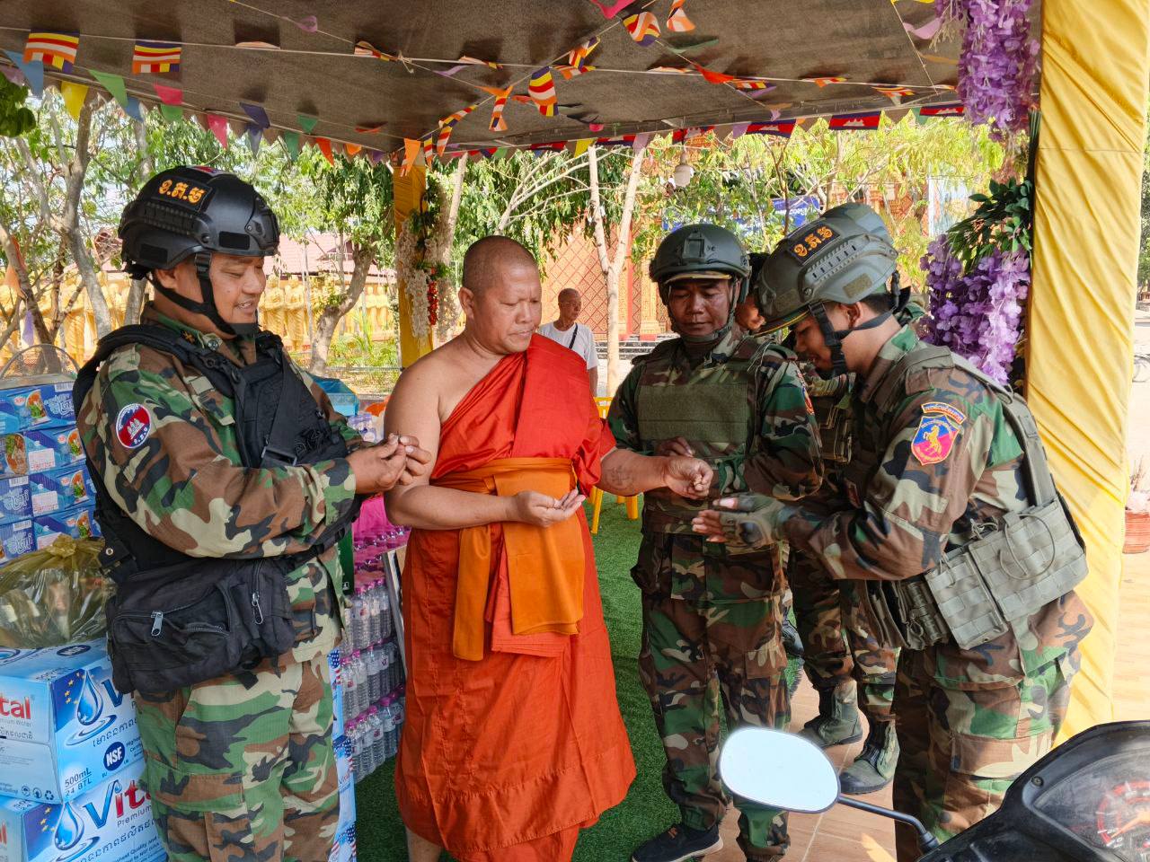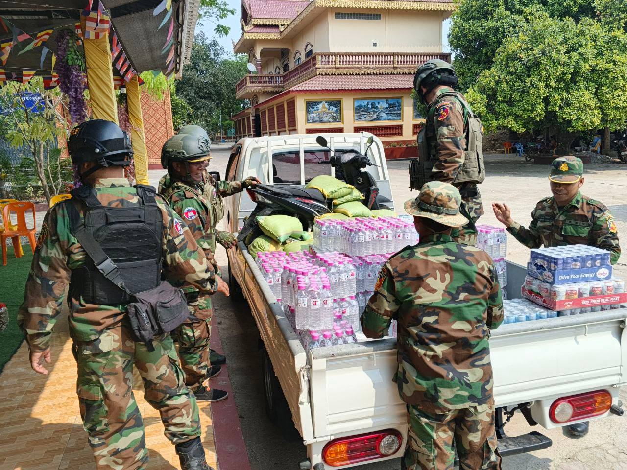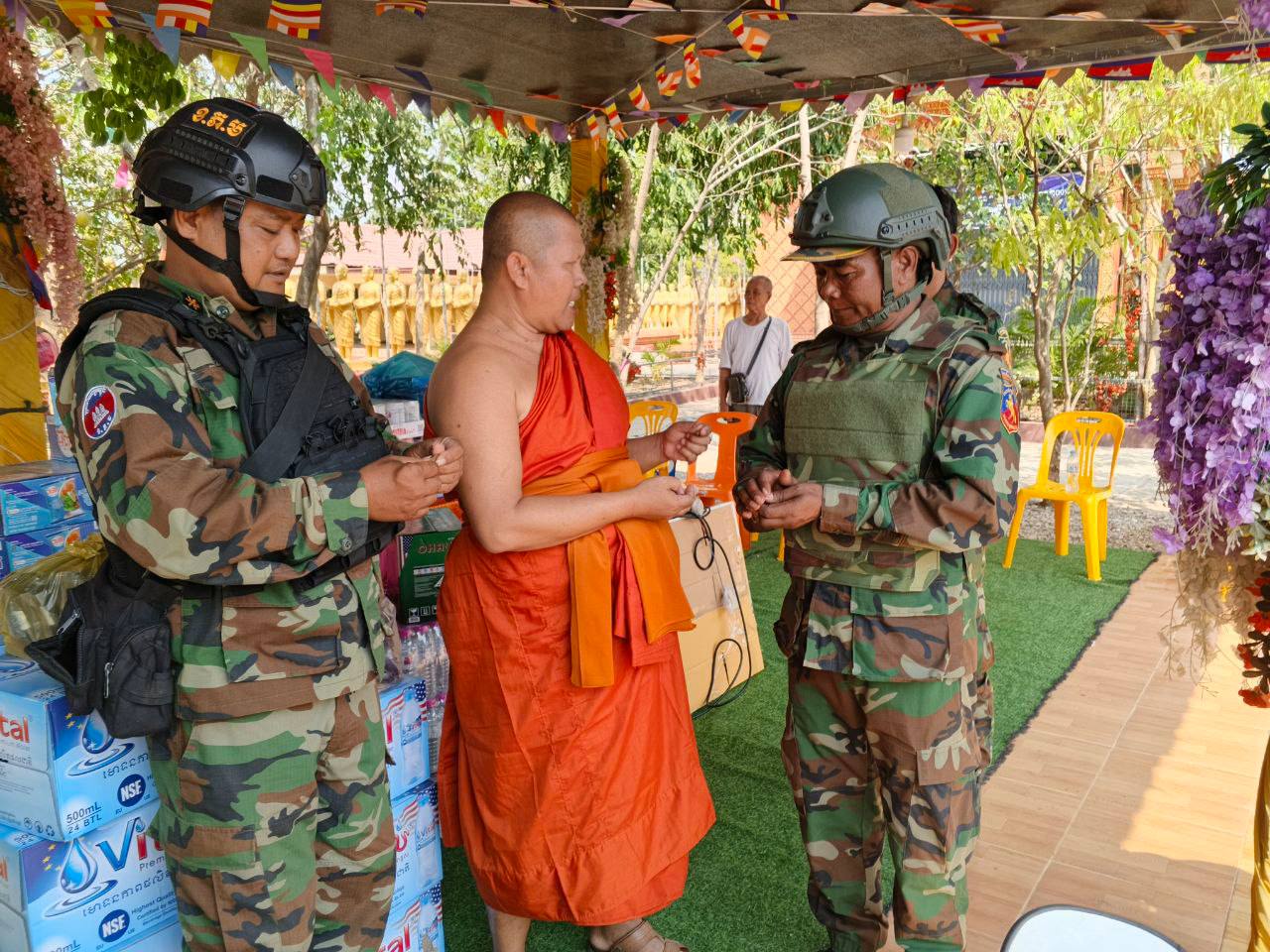 ខេត្តបន្ទាយមានជ័យ ៖ វីរៈកងទ័ពជួរមុខប្រចាំទិសតំបន់ជោគជ័យ និងព្រៃចាន់ ទទួលគ្រឿងបរិភោគពីព្រះគ្រូចៅអធិការវត្តចម្កាខ្នុរ កាលពីថ្ងៃទី២៣ ខែកុម្ភៈ ឆ្នាំ២០២៦ ក្រុងសិរីសោភ័ណ។