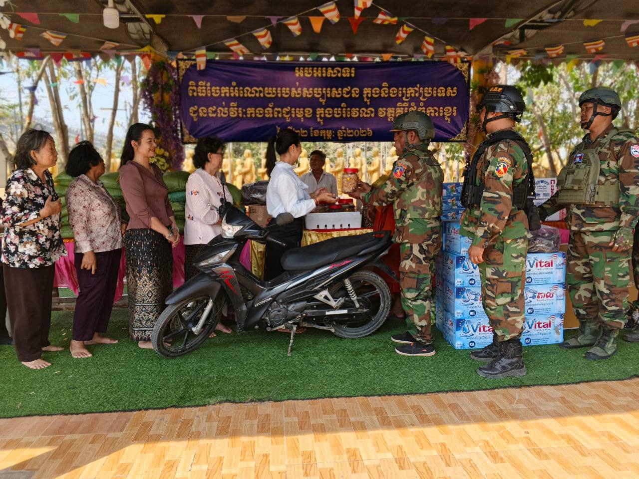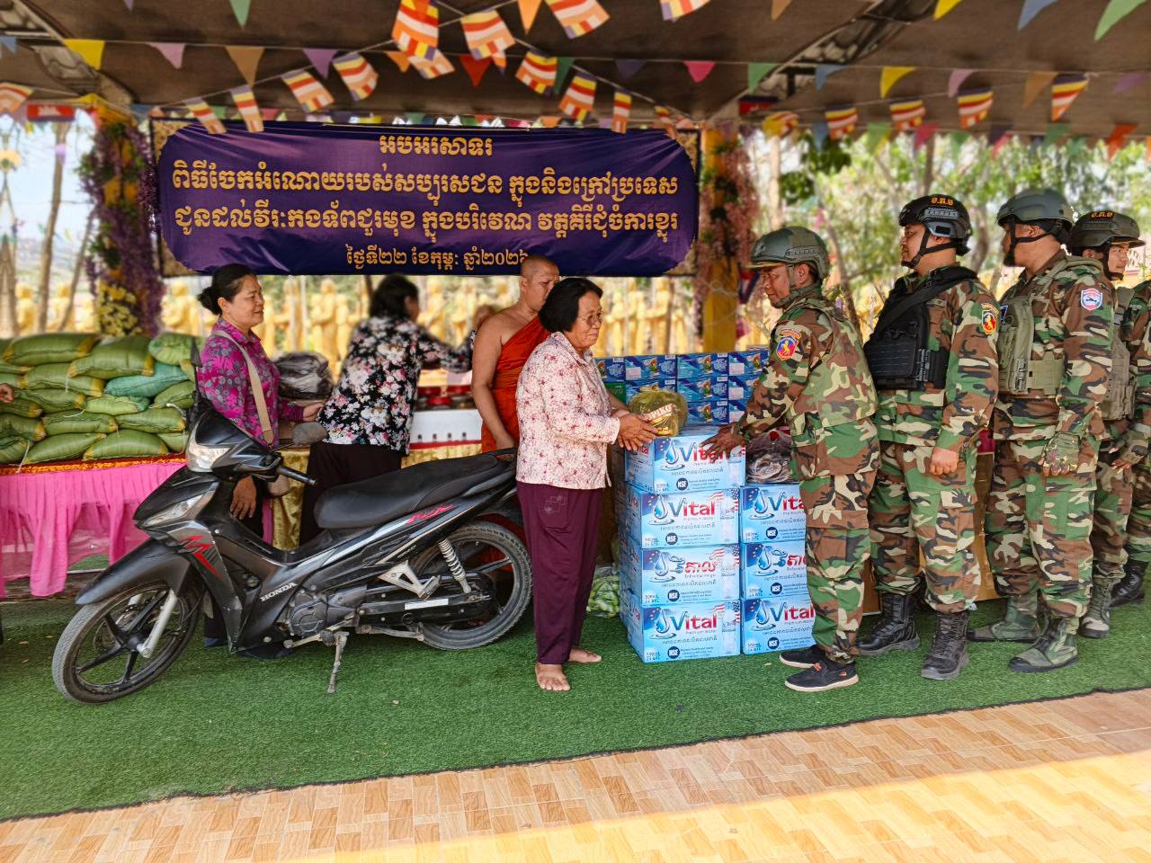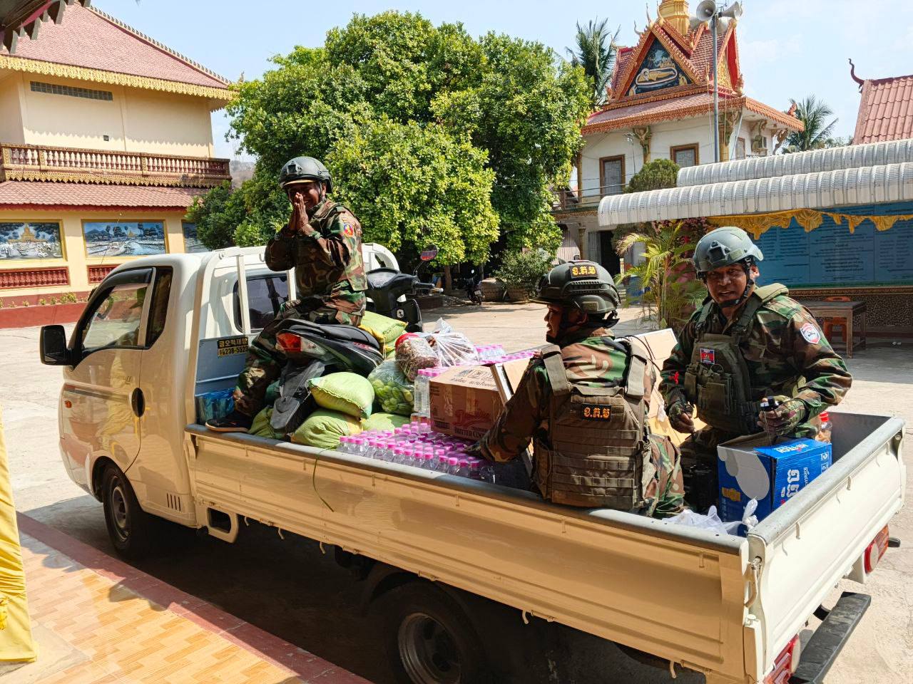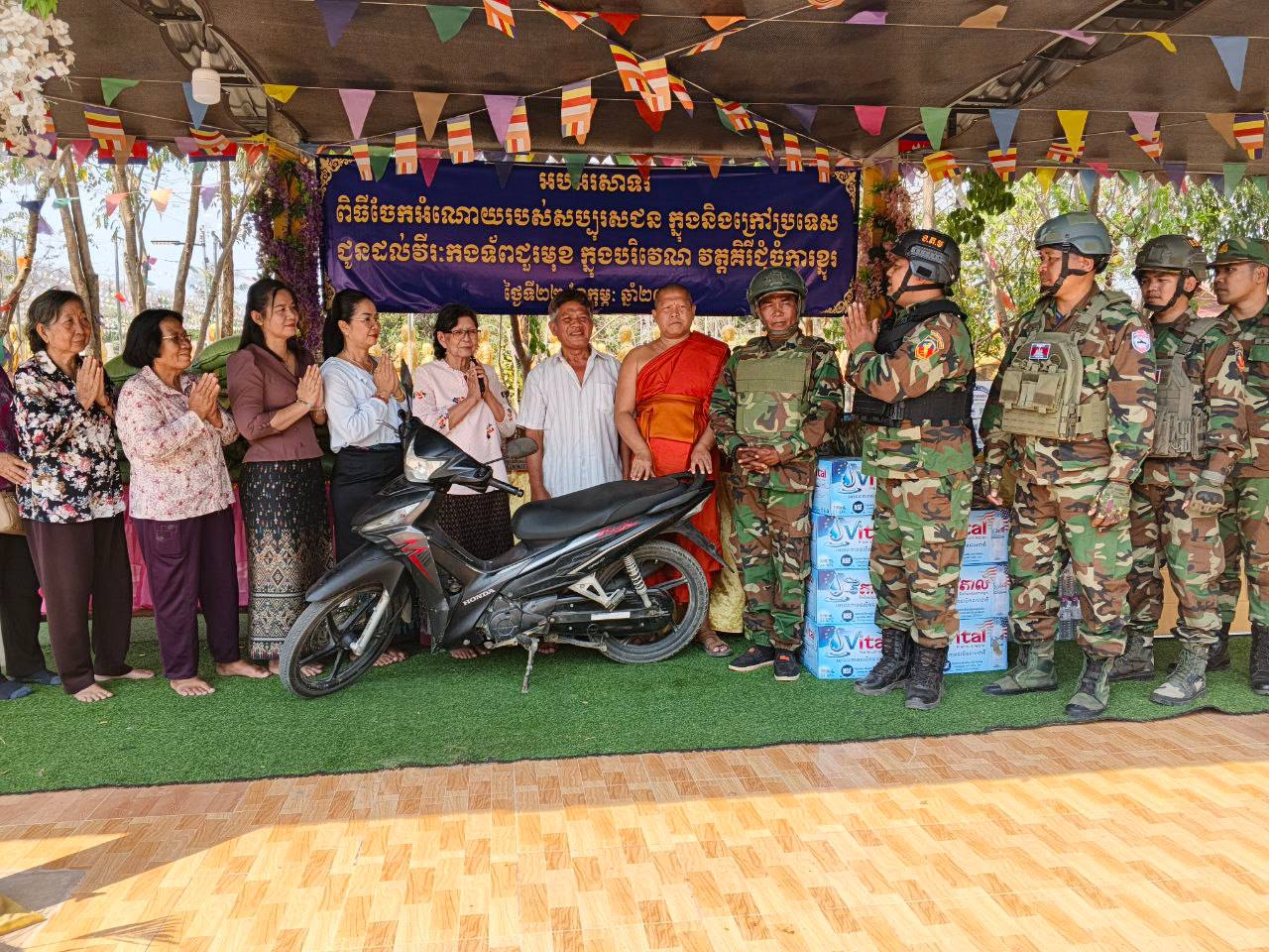 ខេត្តបន្ទាយមានជ័យ ៖ វីរៈកងទ័ពជួរមុខប្រចាំទិសតំបន់ជោគជ័យ និងព្រៃចាន់ ទទួលគ្រឿងបរិភោគពីព្រះគ្រូចៅអធិការវត្តចម្កាខ្នុរ កាលពីថ្ងៃទី២៣ ខែកុម្ភៈ ឆ្នាំ២០២៦ ក្រុងសិរីសោភ័ណ។