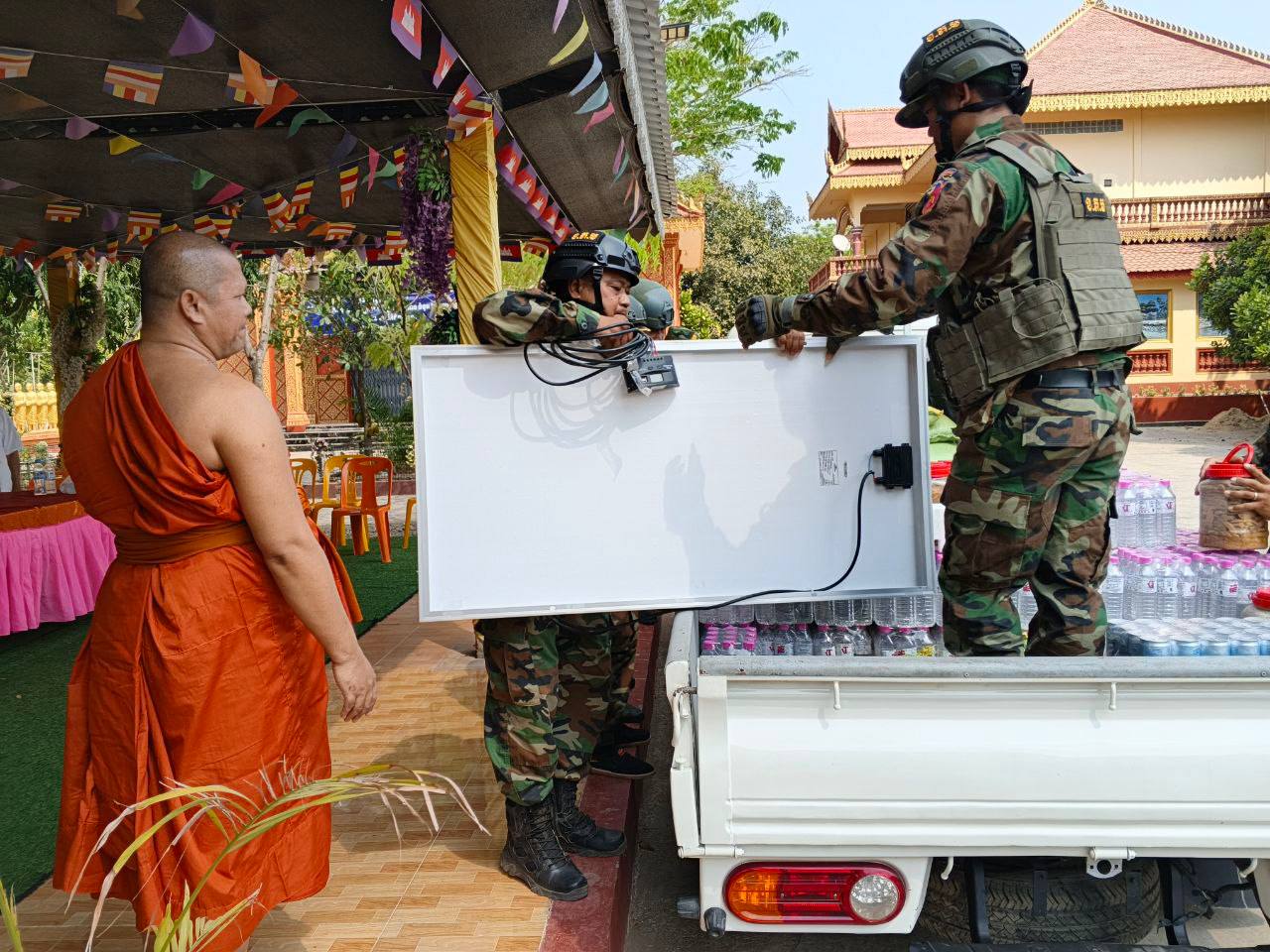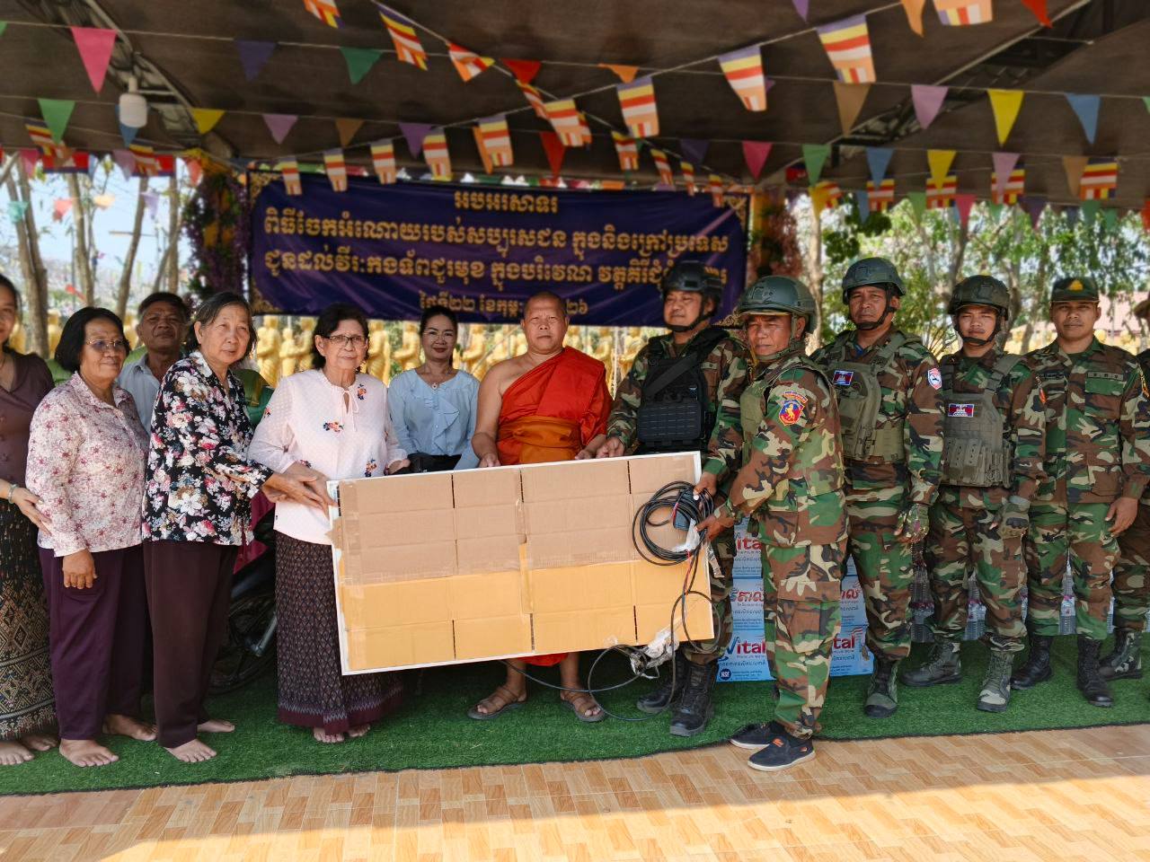 ព្រះសមណៈញាណ ណាប់ ម៉ឺន មានសង្ឃដិការថា គ្រឿងបរិភោគនិងឧបភោគដែលប្រគល់ជូនកម្លាំងជួរមុខពេលនេះមាន ម៉ូតូ១គ្រឿង អង្ករ៣០០គីឡូក្រាម មី១០កេស កាហ្វេ២០កញ្ចប់ធំ ប្រហុកសាច់១២គីឡូក្រាម ផ្អកសាច់១២គីឡូក្រាម ត្រីងៀត១០គីឡូក្រាម ត្រីខ២កេសធំ ឆៃប៉ូវ៤កែវ ផ្ទាំងសូឡាធំ១ផ្ទាំង អាគុយស្ងួត១គ្រាប់និងថវិការ៨០ម៉ឺនរៀល ៕