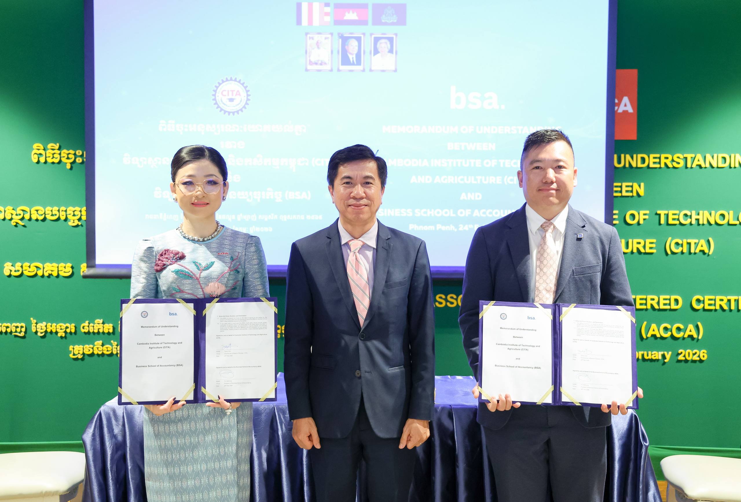 រាជធានីភ្នំពេញ ៖ នៅថ្ងៃទី ២៤ ខែកុម្ភៈ ឆ្នាំ២០២៦ វិទ្យាស្ថានបច្ចេកវិទ្យា និងកសិកម្មកម្ពុជា (CITA) បានចុះអនុស្សរណៈនៃការយោគយល់គ្នា (MoU) ជាមួយសមាគមគណនេយ្យករជំនាញ (ACCA) និងវិទ្យាស្ថានគណនេយ្យធុរកិច្ច (BSA) ដែលពិធីនេះប្រព្រឹត្តទៅក្រោមអធិបតី ឯកឧត្តម ជា កុសល រដ្ឋលេខាធិការ តំណាងដ៏ខ្ពង់ខ្ពស់របស់ ឯកឧត្តម ហេង សួរ រដ្ឋមន្ត្រីក្រសួងការងារ និងបណ្តុះបណ្តាលវិជ្ជាជីវៈ នៅសណ្ឋាគារ ហៃយ៉ាត់ រេជិនស៊ី រាជធានីភ្នំពេញ។