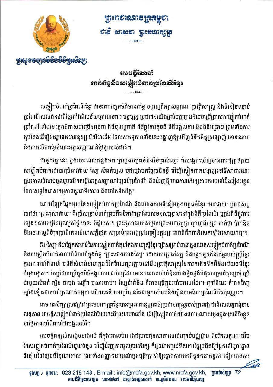 ក្រសួងវប្បធម៌ និងវិចិត្រសិល្បៈ សូមអំពាវនាវដល់សាធារណជន ជាពិសេសអ្នកច្នៃម៉ូតសម្លៀកបំពាក់ សូមព្យាយាម សិក្សាស្រាវជ្រាវឈ្វេងយល់ឱ្យច្បាស់អំពីប្រវត្តិសម្លៀកបំពាក់ប្រពៃណី ទាំងទម្រង់ និងបរិបទដើមនៃការប្រើប្រាស់ មុននឹង ប្រើប្រាស់ជាសាធារណៈ ព្រោះហេតុថា ការស្រឡាញ់ពេញចិត្តណាមួយ ឬការប្រើប្រាស់អ្វីមួយ ដោយពុំមានការស្វែងយល់ ពីតម្លៃ និងឫសគល់ដើមឱ្យច្បាស់លាស់នោះ អាចនាំមកនូវលទ្ធផលអវិជ្ជមាន ធ្វើឱ្យខូចខាតឬបាត់បង់តម្លៃនៃបេតិកភណ្ឌ ជាតិខ្លួនទៅវិញ ៕