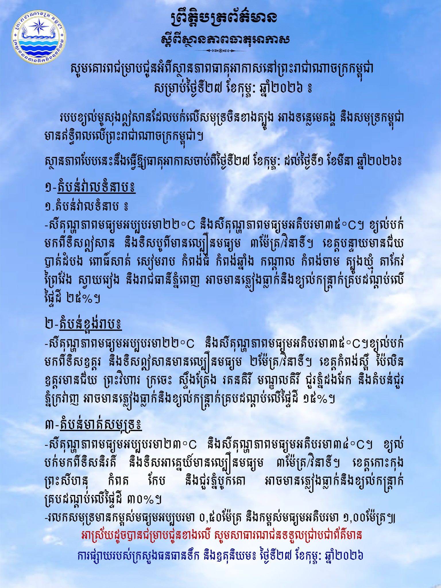 រាជធានីភ្នំពេញ៖ ក្រសួងធនធានទឹក និងឧតុនិយម បានឱ្យដឹងថា ចាប់ពីថ្ងៃទី ២៧ ខែកុម្ភៈ ដល់ថ្ងៃទី ០១ ខែមីនា ឆ្នាំ ២០២៦ កម្ពុជាអាចនឹងមានភ្លៀងធ្លាក់ លាយឡំខ្យល់កន្ត្រាក់នៅតាមតំបន់មួយចំនួន។
