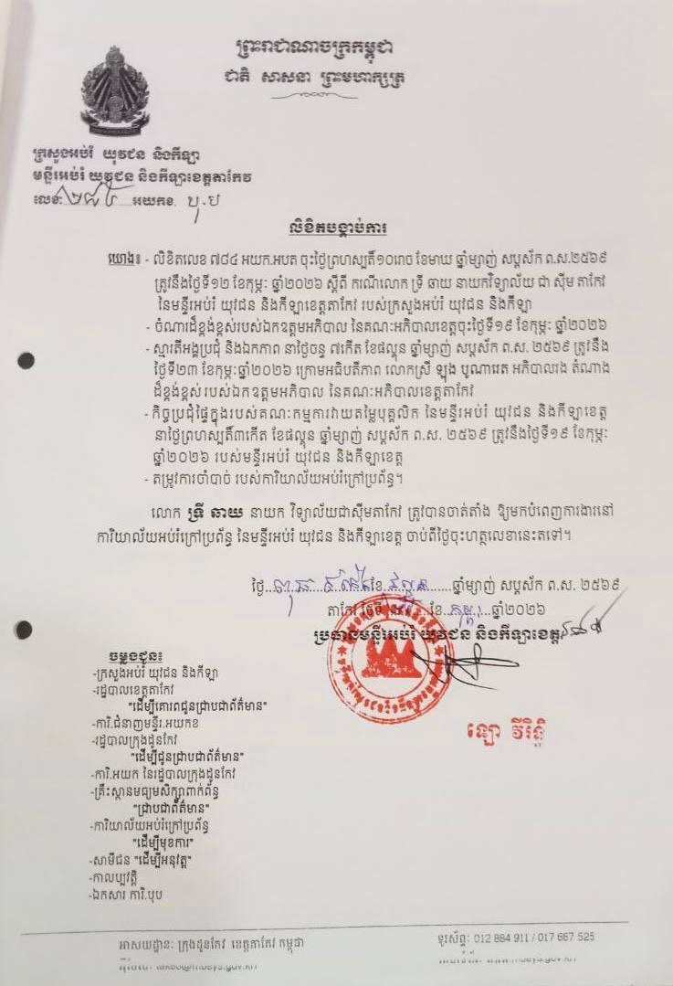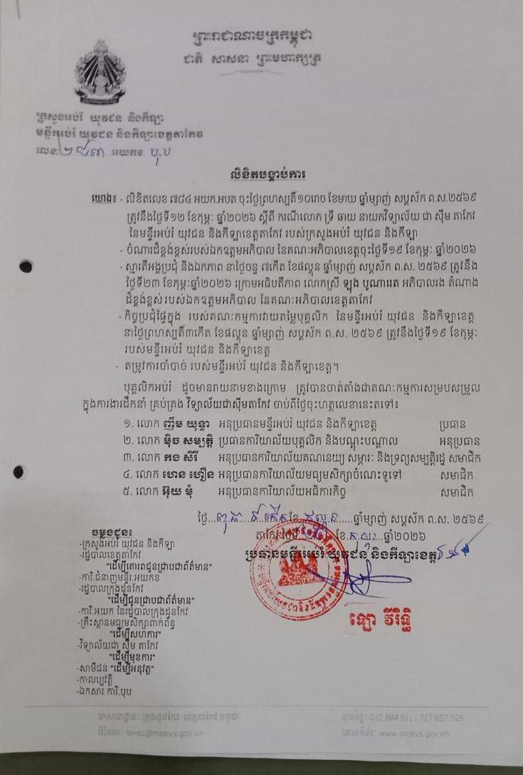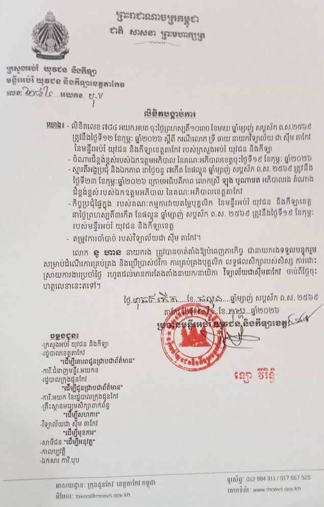 រដ្ឋមន្ត្រីក្រសួងអប់រំ បានសម្រេចថា ទី១៖ ធ្វើការផ្លាស់ដោយបង្ខំលោក ទ្រី ឆាយ នាយកវិទ្យាល័យ «ជាស៊ីមតាកែវ» ឱ្យទៅបម្រើការងារនៅអង្គភាពក្រោម ឱវាទមន្ទីរអប់រំ យុវជន និងកីឡាខេត្តតាកែវ