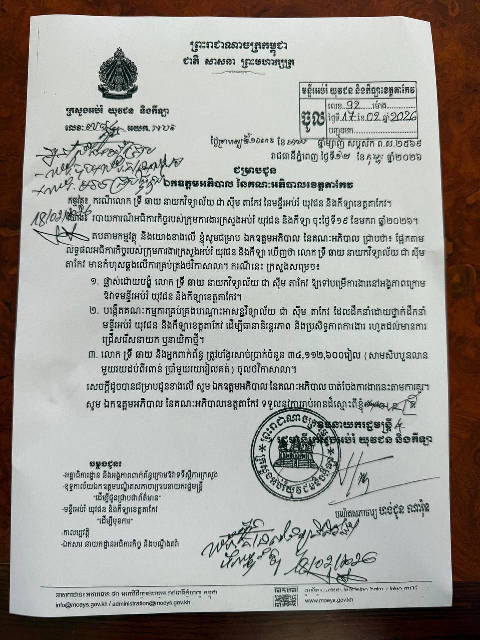 ទី៣៖ លោក ទ្រី ឆាយ និងអ្នកពាក់ព័ន្ធ ត្រូវបង្វែរសាច់ប្រាក់ចំនួន ៣៤,១១២,៦០០រៀល ចូលថវិកាសាលា។